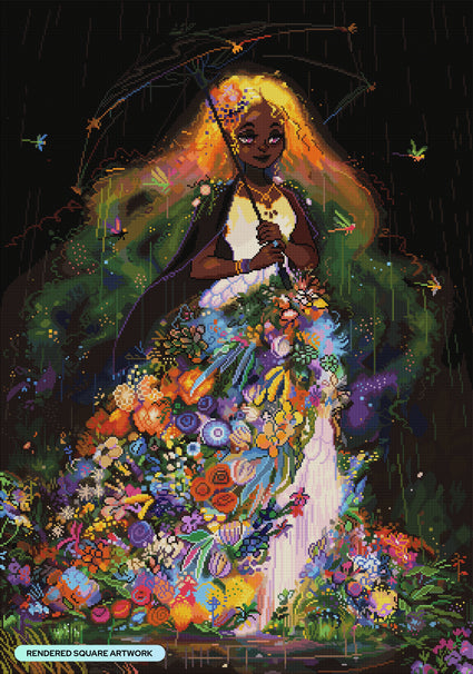 Wander through an enchanting, rain-filled evening adorned in a gown of fresh blossoms. Discover strength in the radiant defiance of the downpour and energy in the hum of luminous dragonflies....