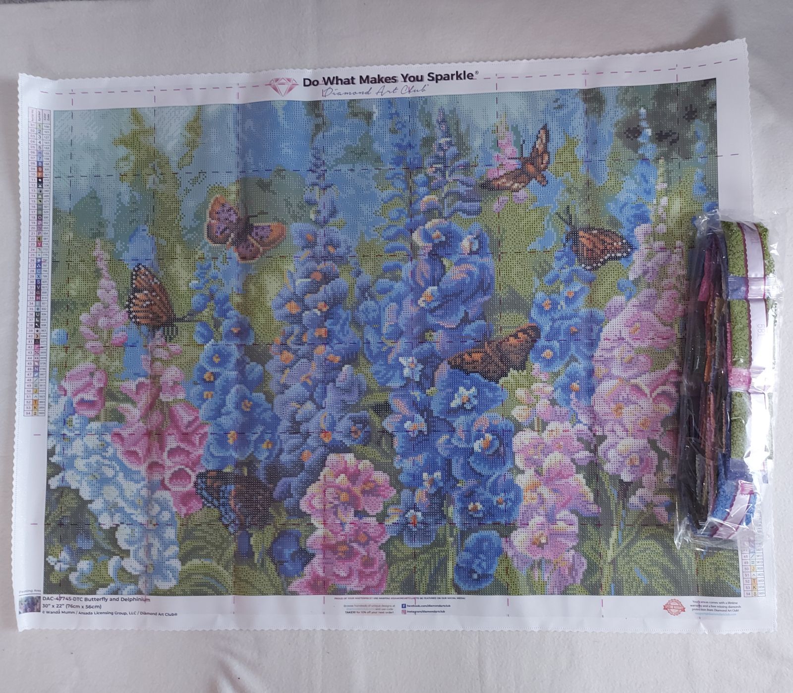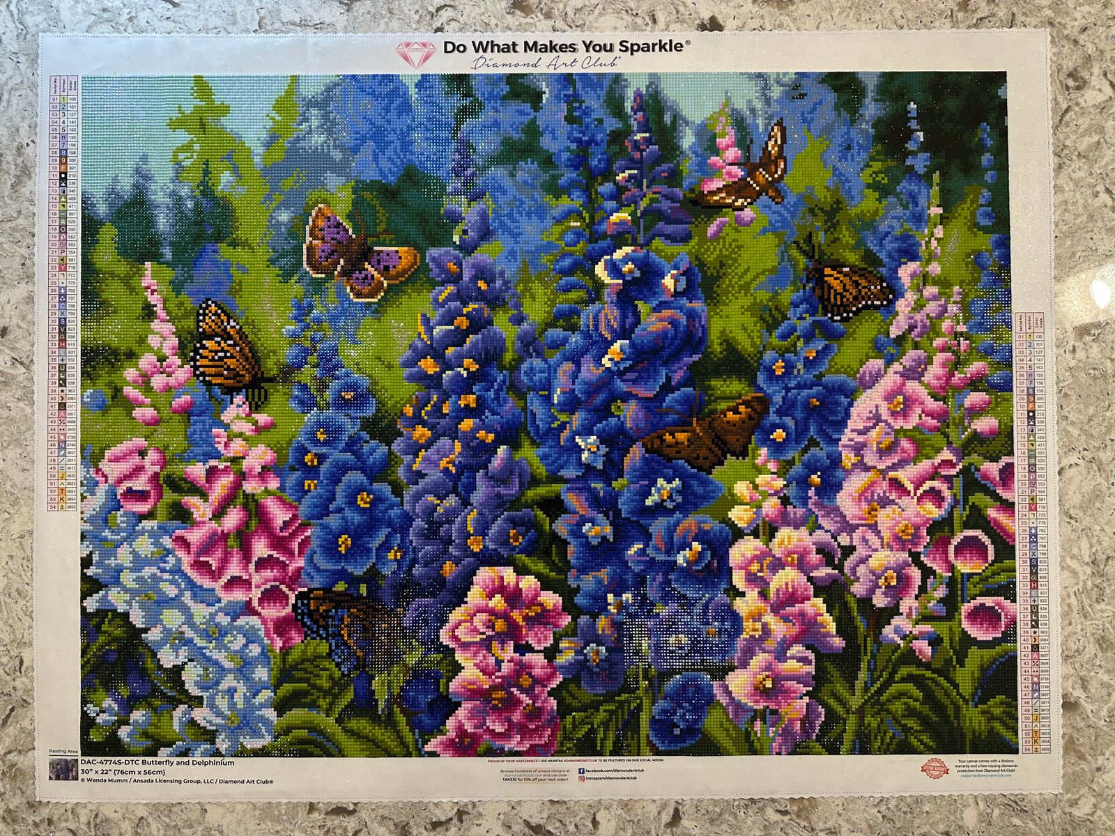 This was my very first DAC artwork and I couldn’t be more thrilled with how it turned out! The art by Wanda Mumm is absolutely gorgeous—the jewel-tone colours are incredibly rich, and the diamond detailing is stunning. I love how the flowers are so intricate and the background is so dreamy. I haven’t framed it yet, but everyone I’ve shown it to has been genuinely impressed. This project took me over 250 hours to complete. Before this, I had only done three basic 20–30 hour kits from an online shopping site but I wanted something more challenging. After searching for the “best diamond art kits,” I discovered Diamond Art Club—and I’m so grateful I did!”