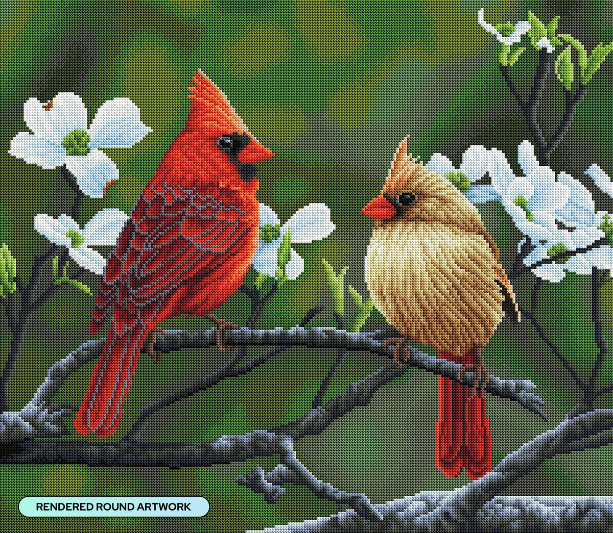 Perch among the snow-white blossoms with these shimmering cardinal companions. A duet of elegance and color, their gentle presence enhances nature’s quiet harmony and beauty.