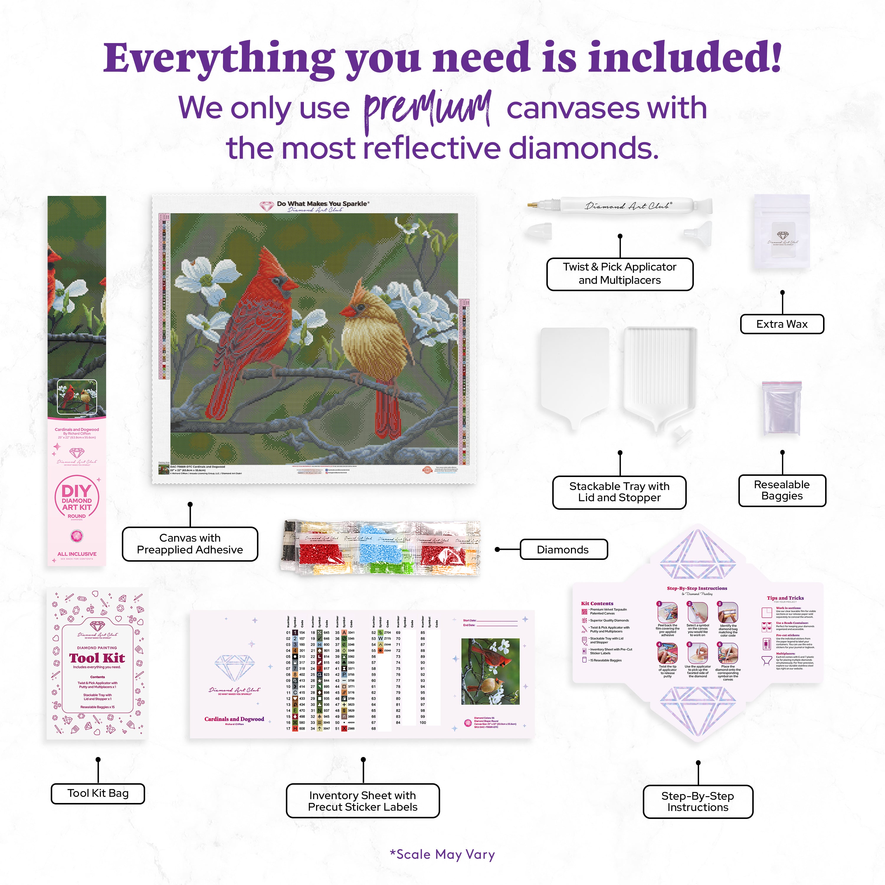 Canvas x 1, Diamonds, Tray x 1, Applicator + Grip x 1, Wax x 2
