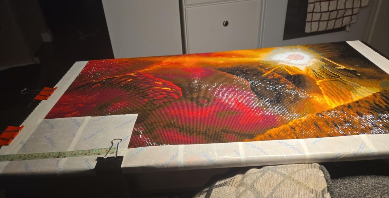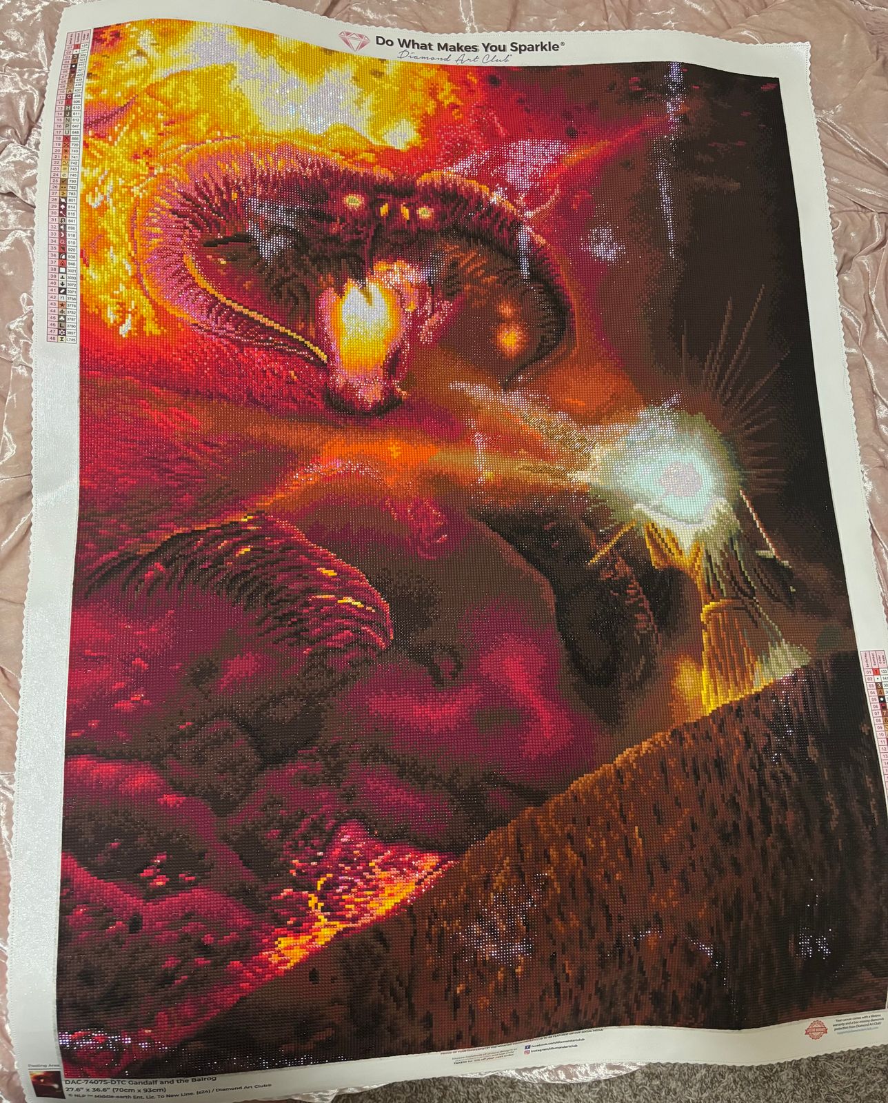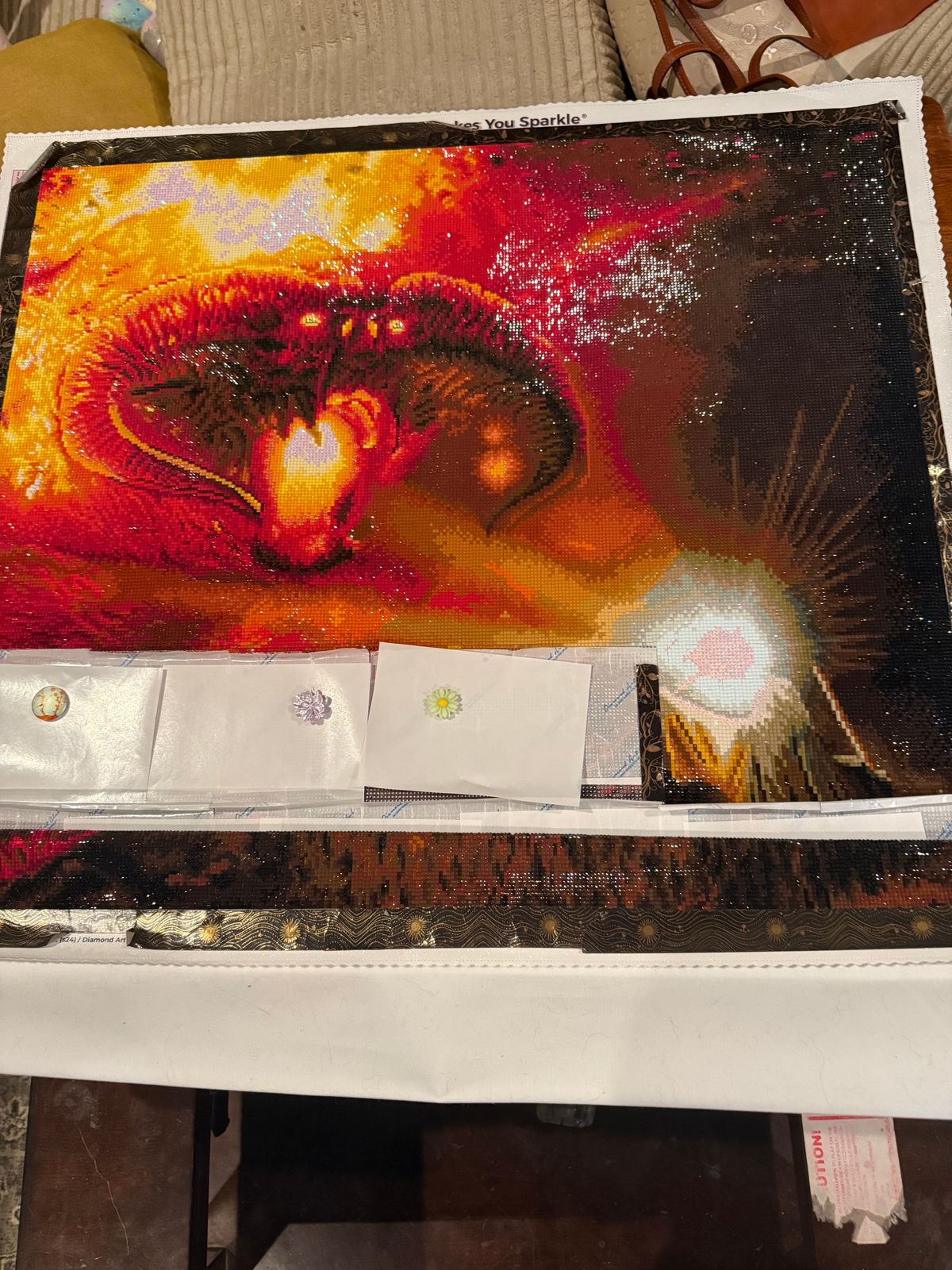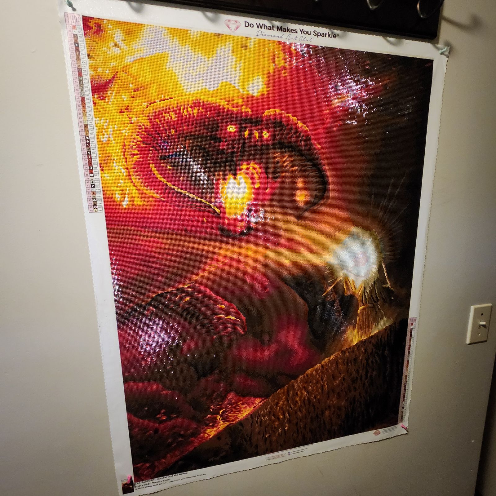 My biggest diamond painting yet and it took me 5 months to complete. Lots of color and line blocking with a bit of confetti so with a lot of focus it could be done more quickly. However, I decided to enhance this one with iridescent and AB drills, which turned out great and was worth the effort!
