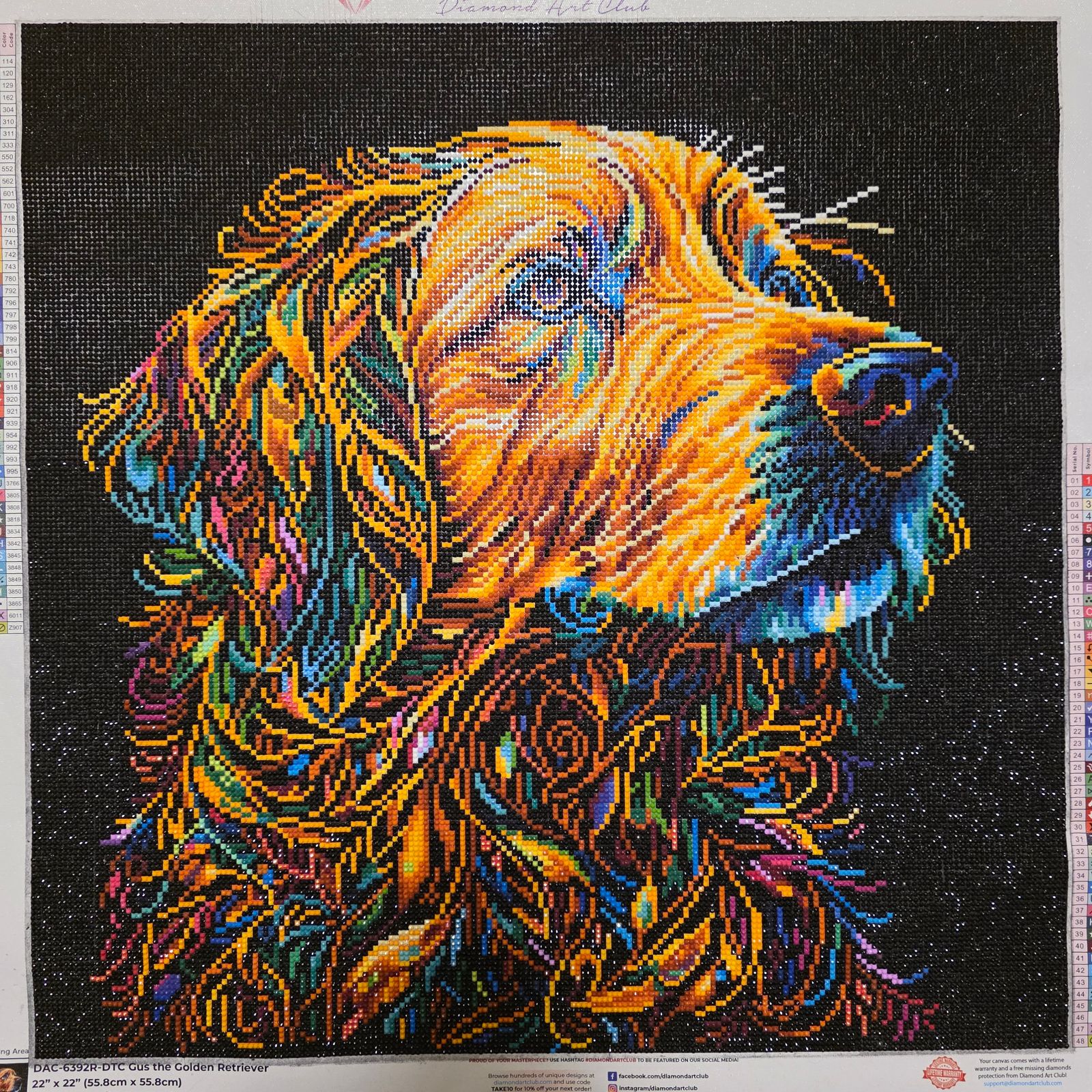 I got this beautiful DP for several reasons….perfect size for me after several large projects, beautiful artwork from one of my favorite artists, and I am a golden retriever owner and lover for decades. I am very excited to work this project and know the outcome will be absolutely stunning!