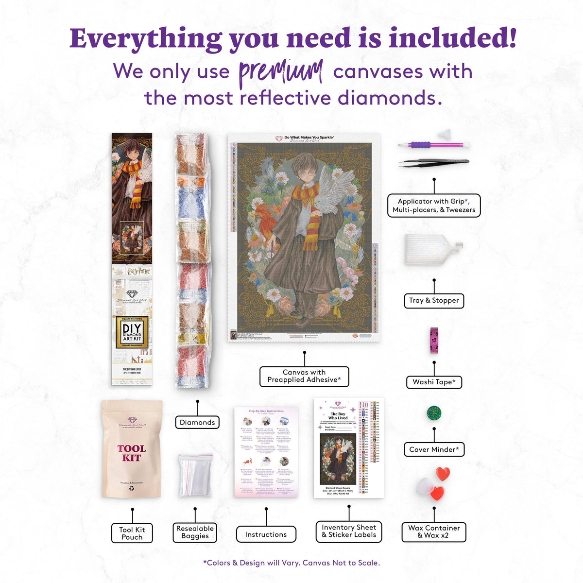 Canvas x 1, Diamonds, Tray x 1, Applicator + Grip x 1, Wax x 2, Tweezers x 1