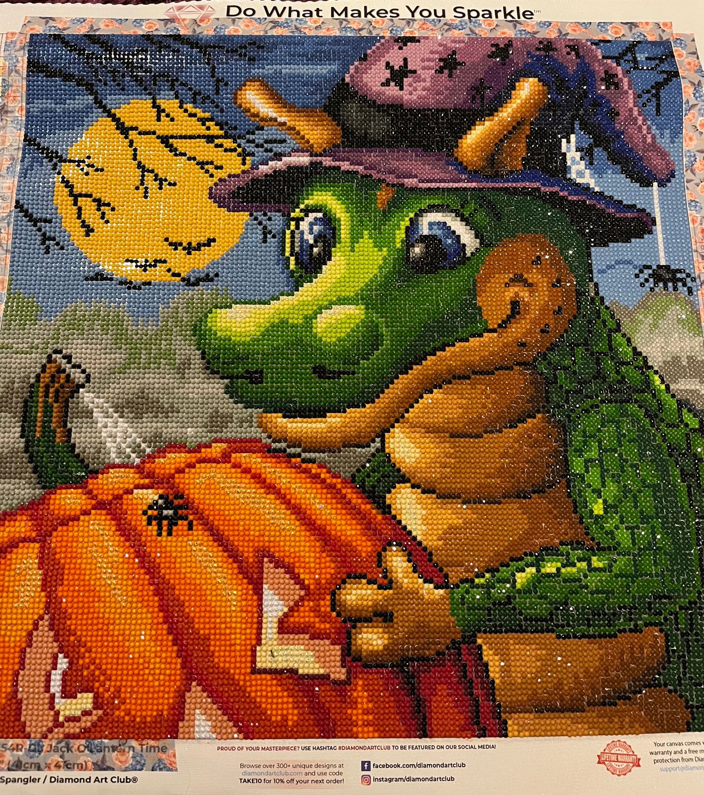 I loved doing this one. I did it in the lead up to Hallowe’en. I loved the little details like the spider on the pumpkin & the spider hanging from the beautiful purple hat. I haven’t charged the glow-in-the-dark drills so I can’t say how they look.