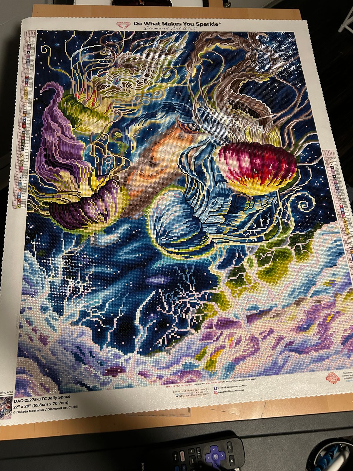 Jelly Space is hands down one of the most breathtaking diamond art canvases I've ever worked on. The colors are rich and vibrant, and the design is pure magic. It feels like you're painting a dream. The blend of celestial elements and floating jellyfish creates such a whimsical, otherworldly vibe that I couldn't take my eyes off it. The canvas quality is excellent, the drills are sparkly and easy to work with, and the symbols are clear and well-printed. This piece is a true conversation starter and will be proudly displayed. Thank you, Diamond Art Club and Dakota Daetwiler, for such a stunning and inspiring work of art!