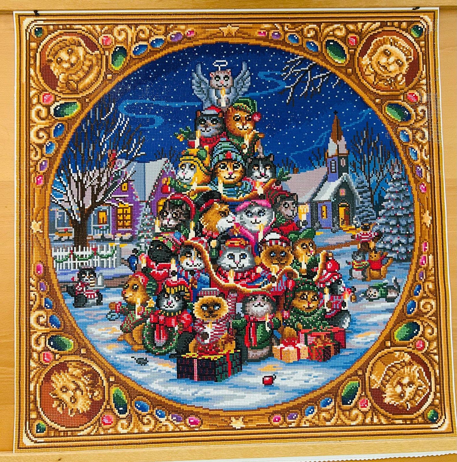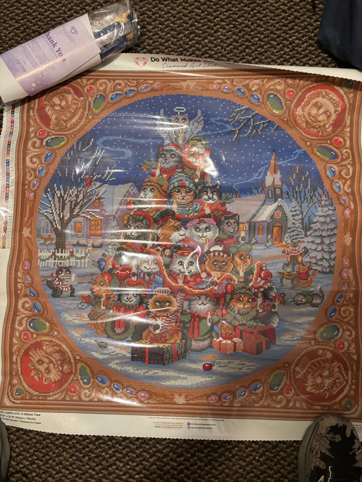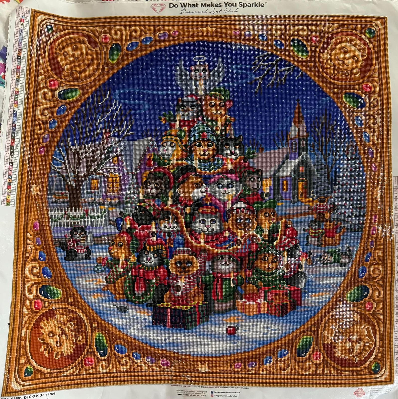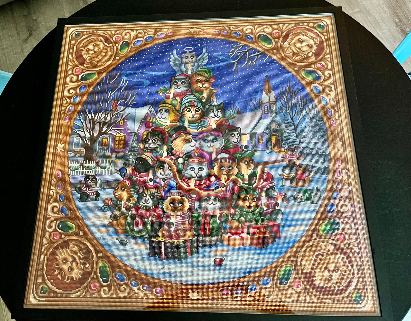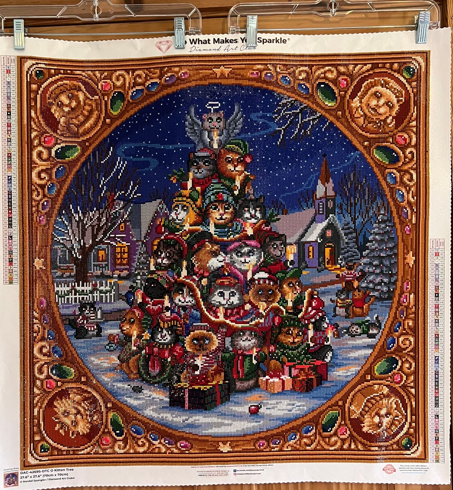 This project was challenging just due to it’s size. Finished project is 28”x28”. Heavy duty canvas backing, well marked and glued. Definitely need to use spacing techniques to get diamonds to line up properly in these very long rows. It was challenging to find a plexiglass frame large enough and under $100. Finally found this one on Bed,Bath and Beyond for $48. I like to put them behind plexiglass instead of sealing with modpodge. It’s beautiful and so sparkly. If you like kittens and Christmas, this is a great project for you.