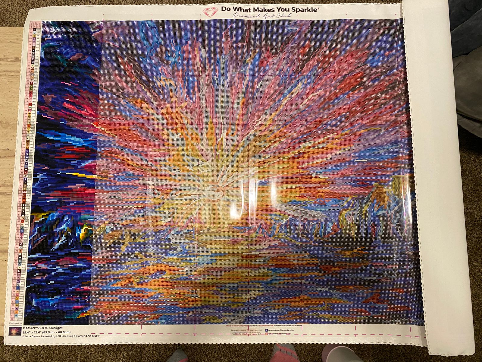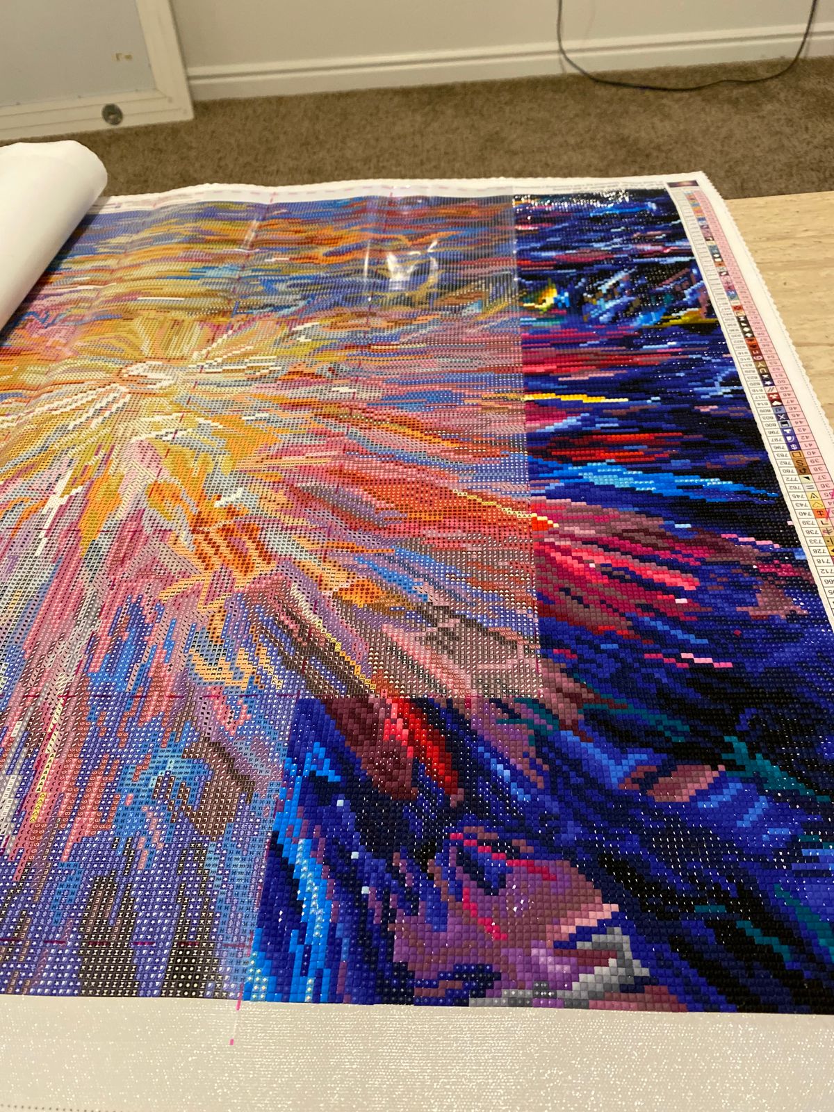 Colors are super vibrant! Turns out much more vibrant than the “not filled in” colors on the canvas. Excellent quality, no gapping at all, and the squares are a dream to work with. The only issue is two of the dark blue symbols are suuuuuper similar and it’s kind of hard to tell them apart. Also, with the high color count, you’ll be switching colors out often if you work within the pre sectioned parts. Tedious, but I like the confetti.