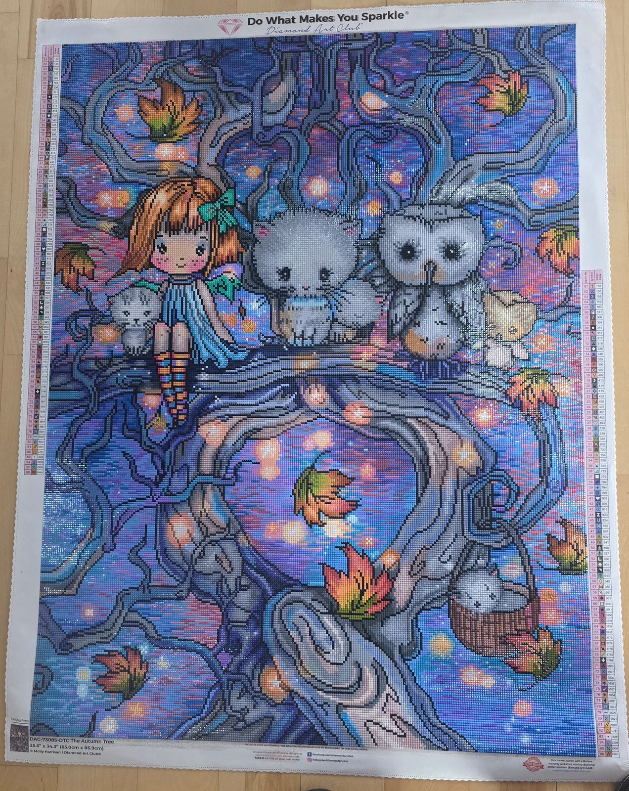 There are a lot of colors and special drills, so the sparkle is no joke. The tree has some confetti, but nothing overwhelming — just enough to keep it from getting boring. The background goes quicker, and the squares fit well. When it’s finished, the picture looks sharp and full of life.