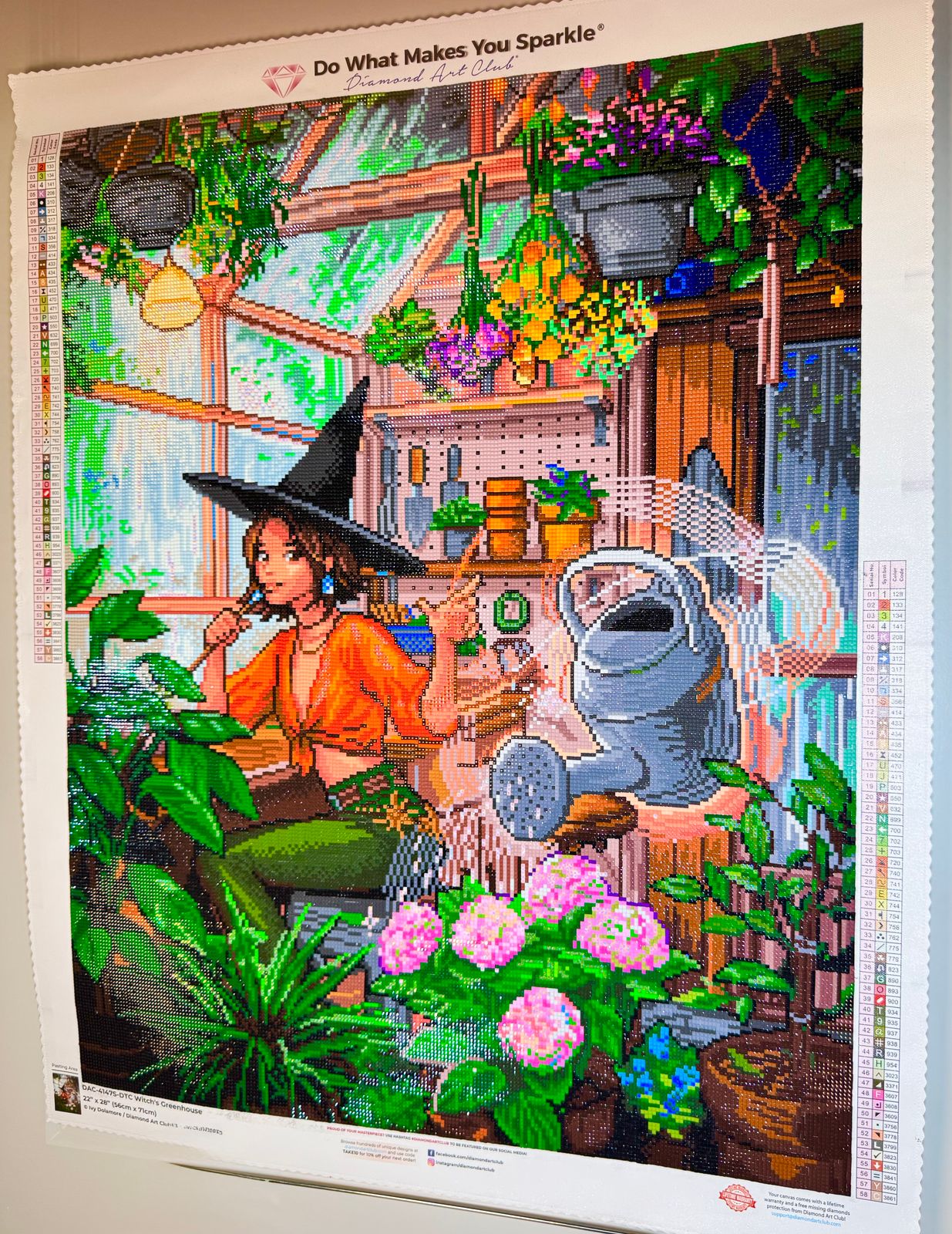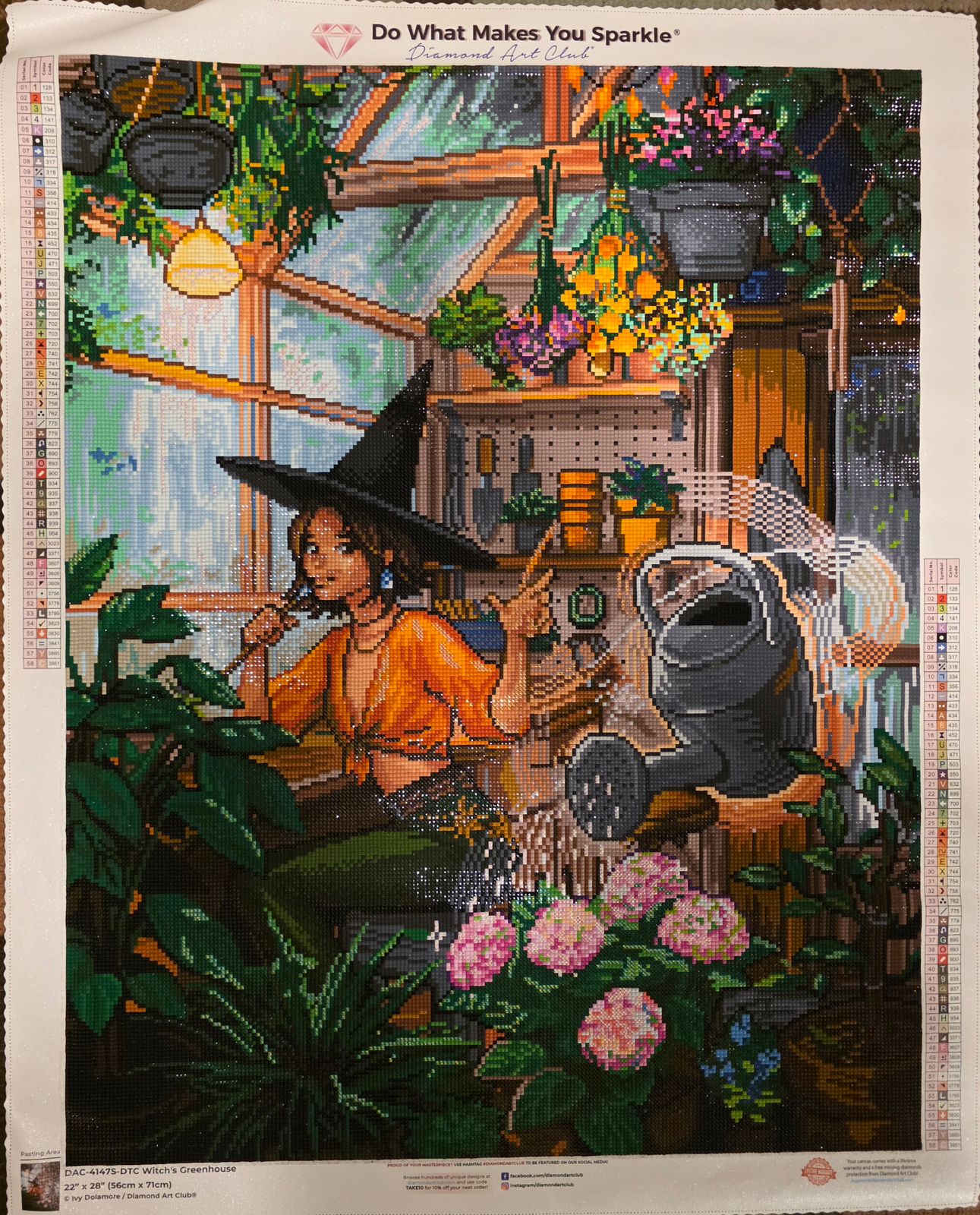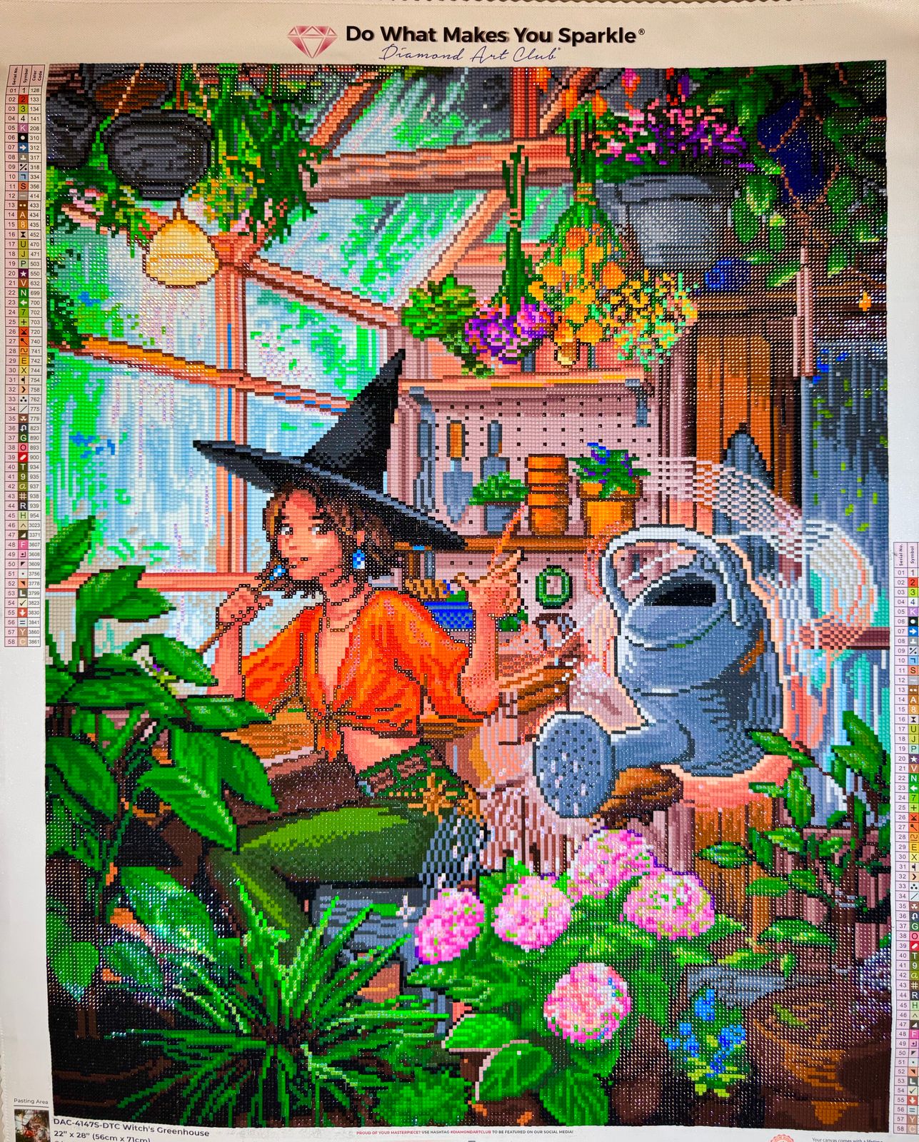 Nice colors, greens and flowers, in cute greenhouse. Size 22x28, square drills