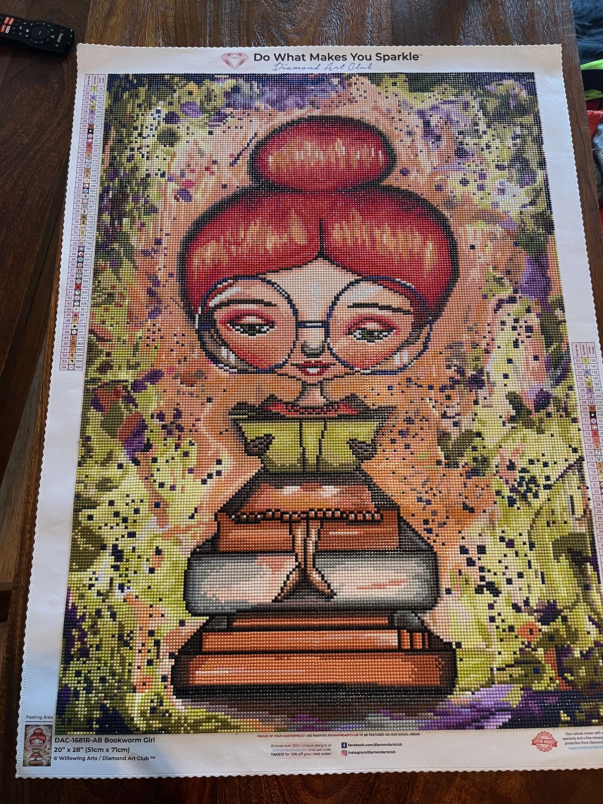 I loved the finish on this one. I picked it up when it had the older round drills so they were harder to work with but the finish was stunning. Loved the ABs and was a mix of confetti in the background and some colour blocking with the books and girl. Would recommend.