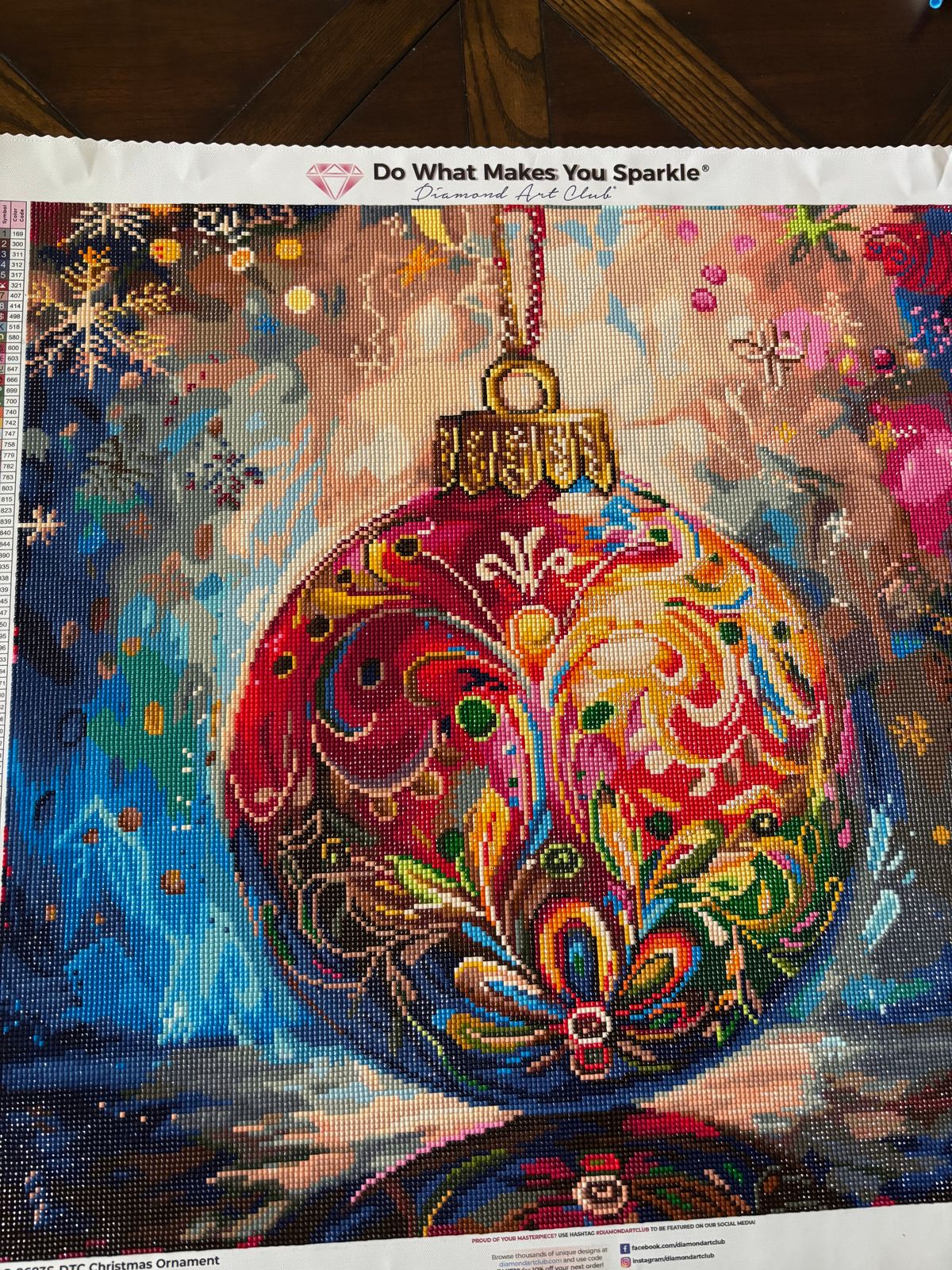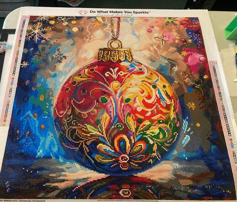 I adore this painting ! I would love to find an actual ornament that looked just like this. I would decorate an entire tree with them. Lots of confetti, but it was not boring or tedious. The colors were amazing, bright, colorful and absolutely gorgeous.