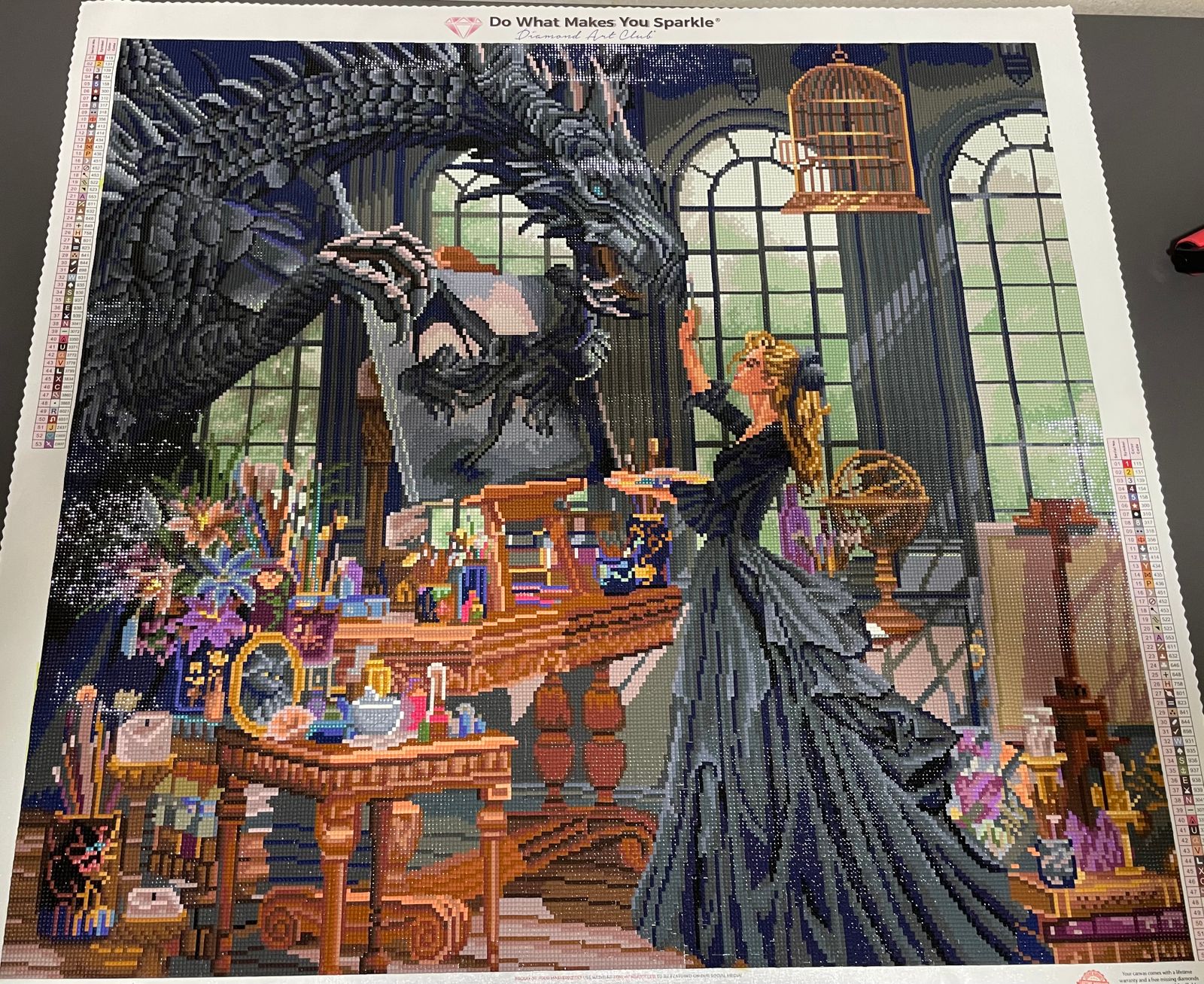 The artwork has a really cool vibe — a dragon in a bright, sunlit space, with those sharp scales and glowing blue eyes stealing the show. The colors pop, and it’s fun watching all the little details come together as you work. It’s a striking, fantasy-filled canvas that looks amazing finished.