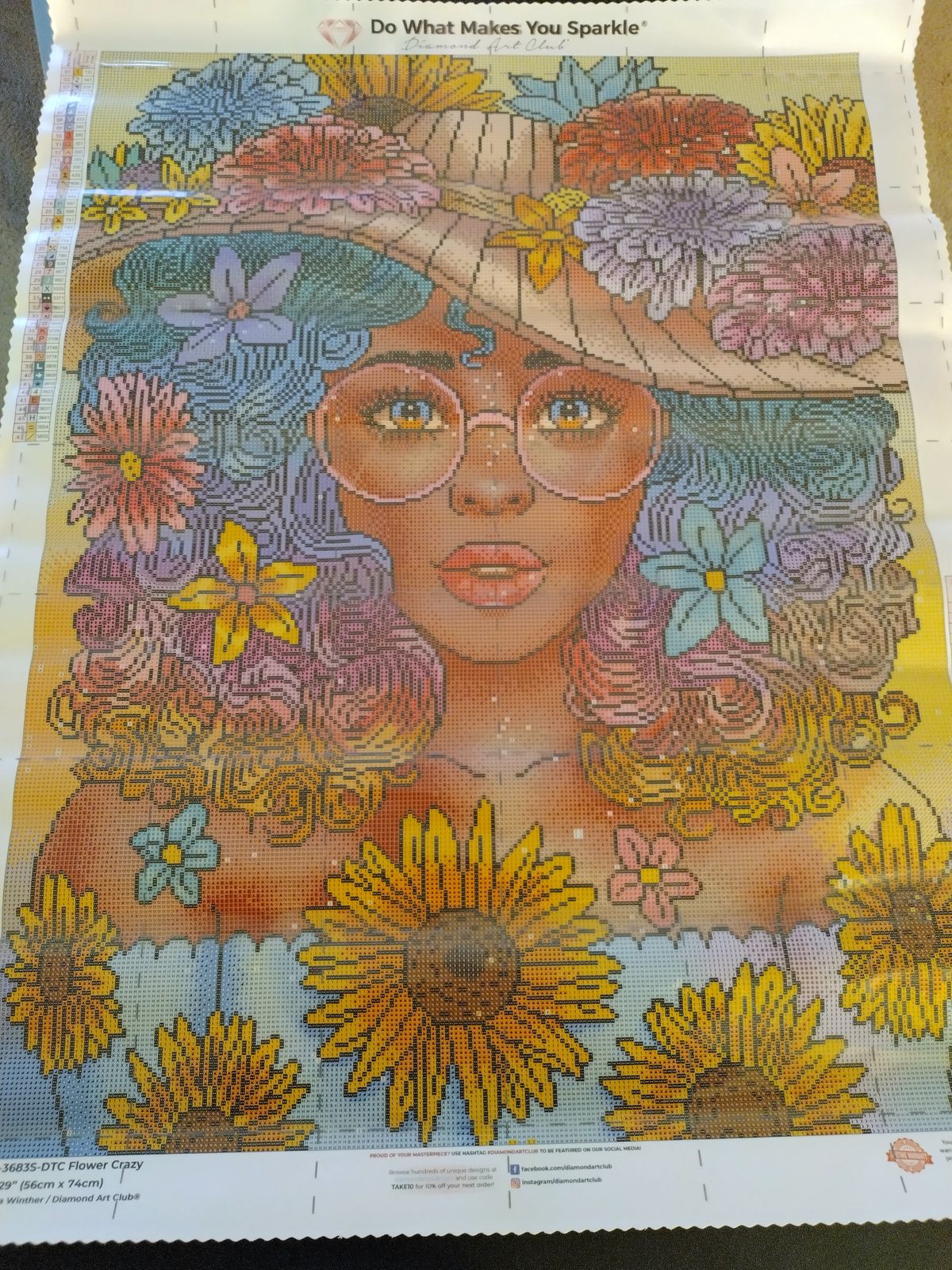 She came out super cute! I added several modifications like to her glasses and the hair. I also swapped out some of the plain drills for sparklers. She's a large painting, but not difficult to complete.