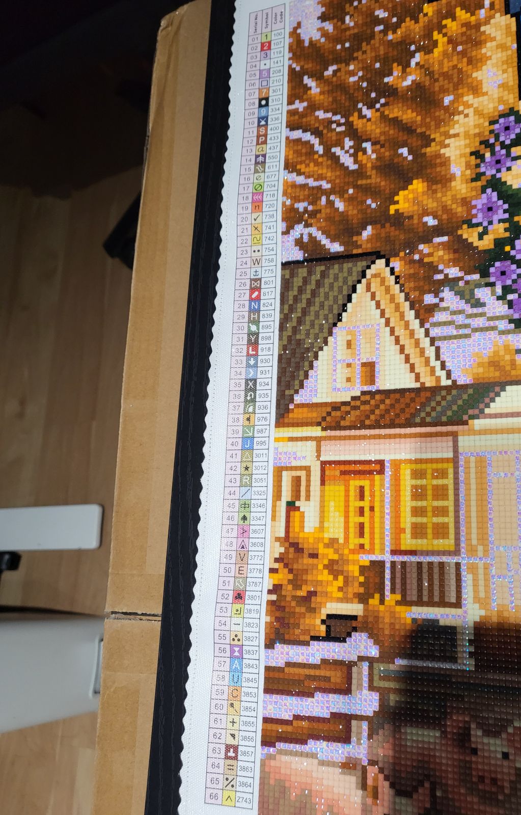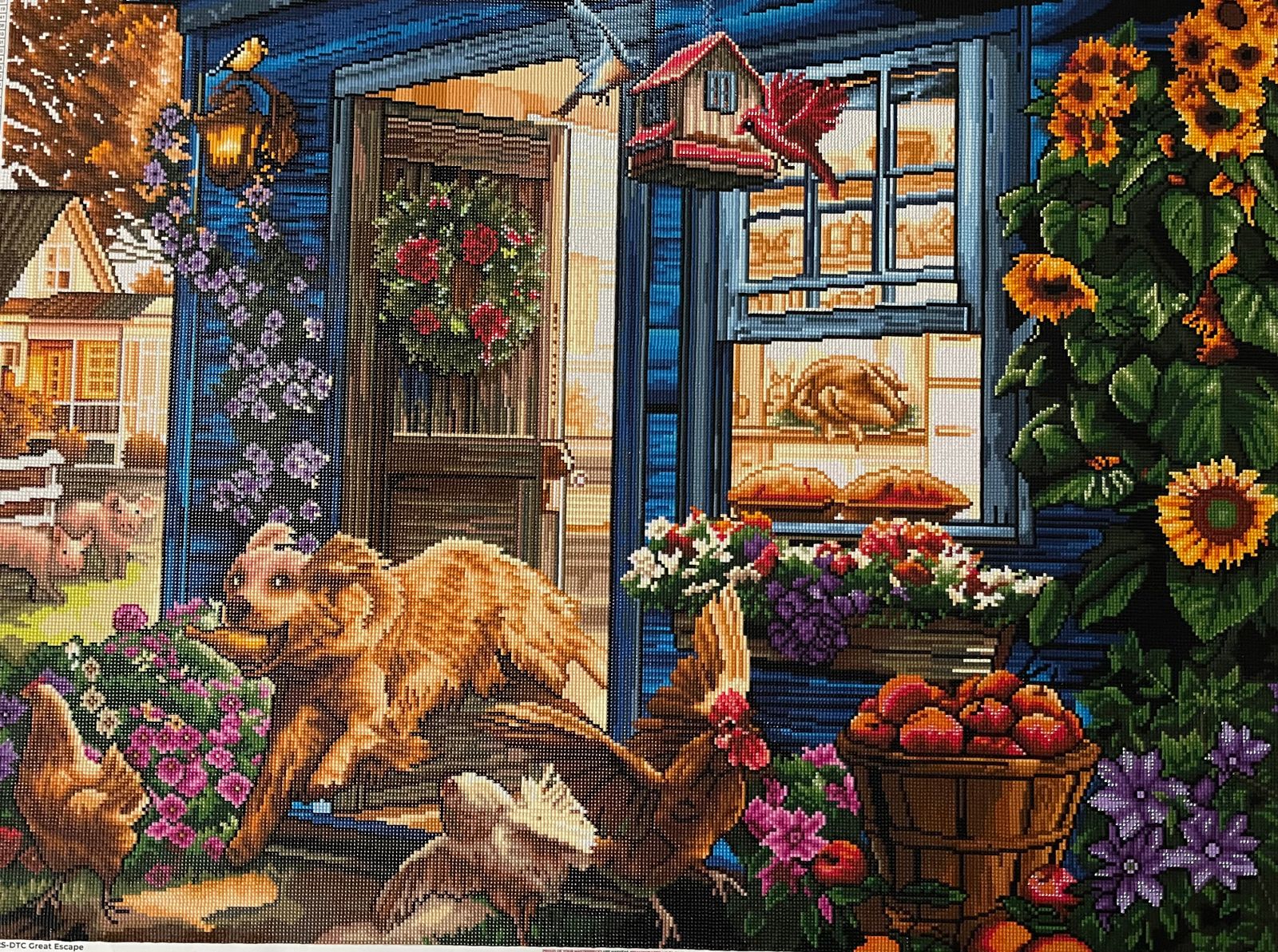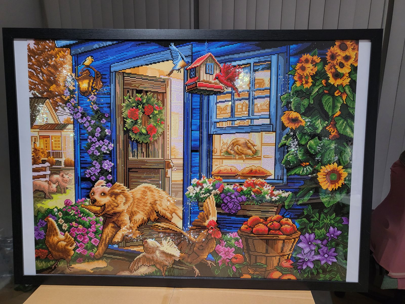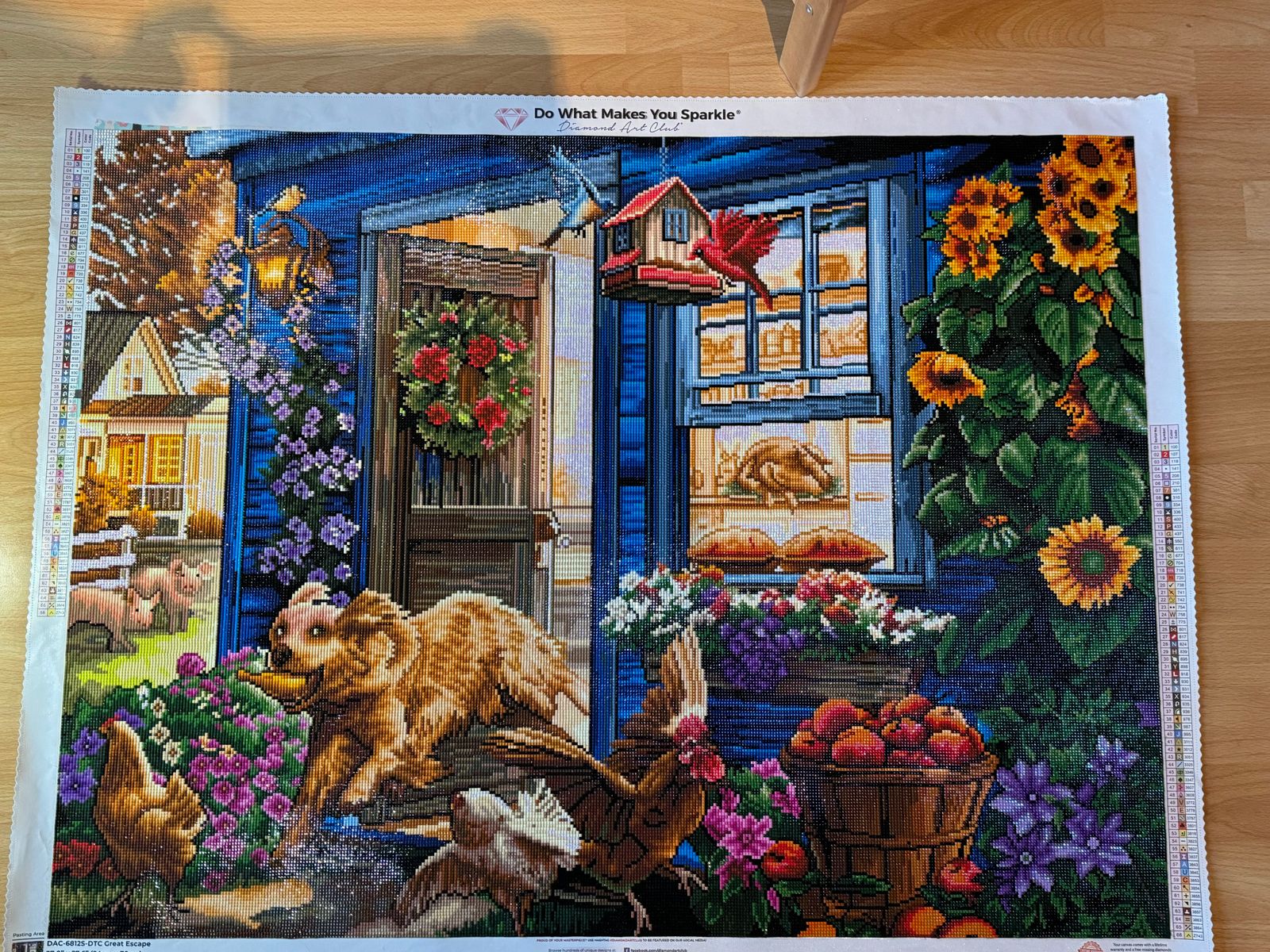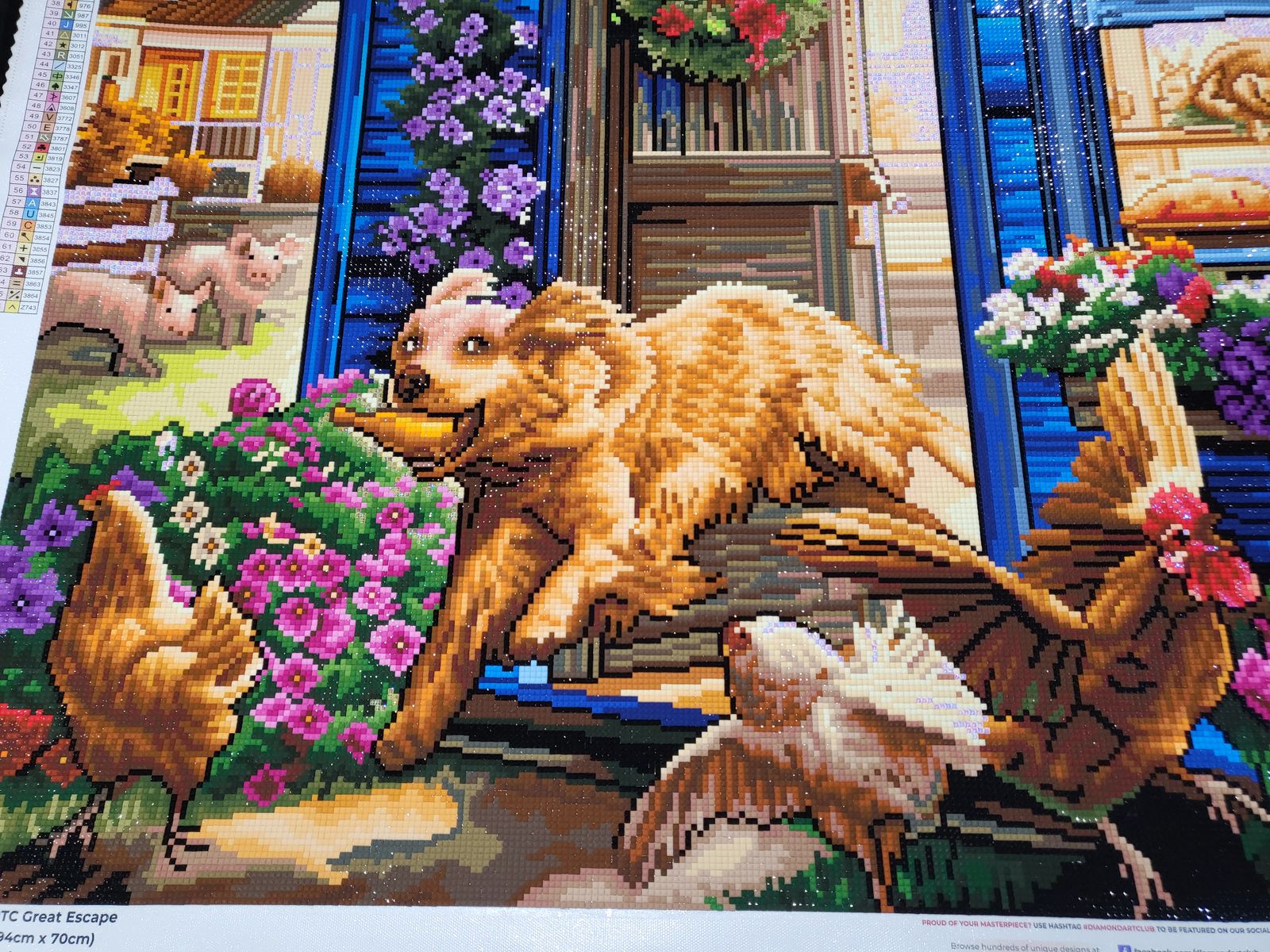 Larry Jones's Great Escape is such a big treat work on. There are pigs, chickens, birds, flowers, and even food throughout the image to work on. And the detail in the golden retreiver is fantastic! I bought my first DAC piece last year from Black Friday Sale and finished it recently. Took me a year to finish because I recently in a car accident so I had to take more breaks. But on average I would assume it would take a beginner 6 months to finish this large piece. This is my first completed diamond painting. I tried other brands out diamond painting and couldn't motivate myself to finish them because the quality were off. When it comes to quality, Diamond Art Club does is best. My puppy accidentally ate all of my "L" diamonds and I messaged DAC about it. They sent me a replacement right away in under a week! I also took a picture of the color symbols because I realized it all their diamond paintings uses different colors for each symbol. Hopefully this helps somebody.