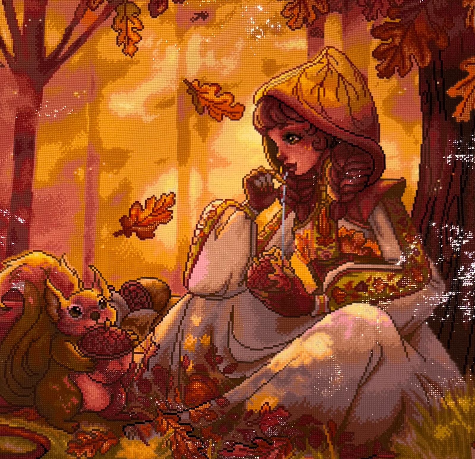 Beautifully done fall painting! I'm not usually one to buy paintings with people in them, but couldn't resist the fall colors, the squirrel, leaves and acorns! Love that it is a reasonable size too that doesn't take forever to do.