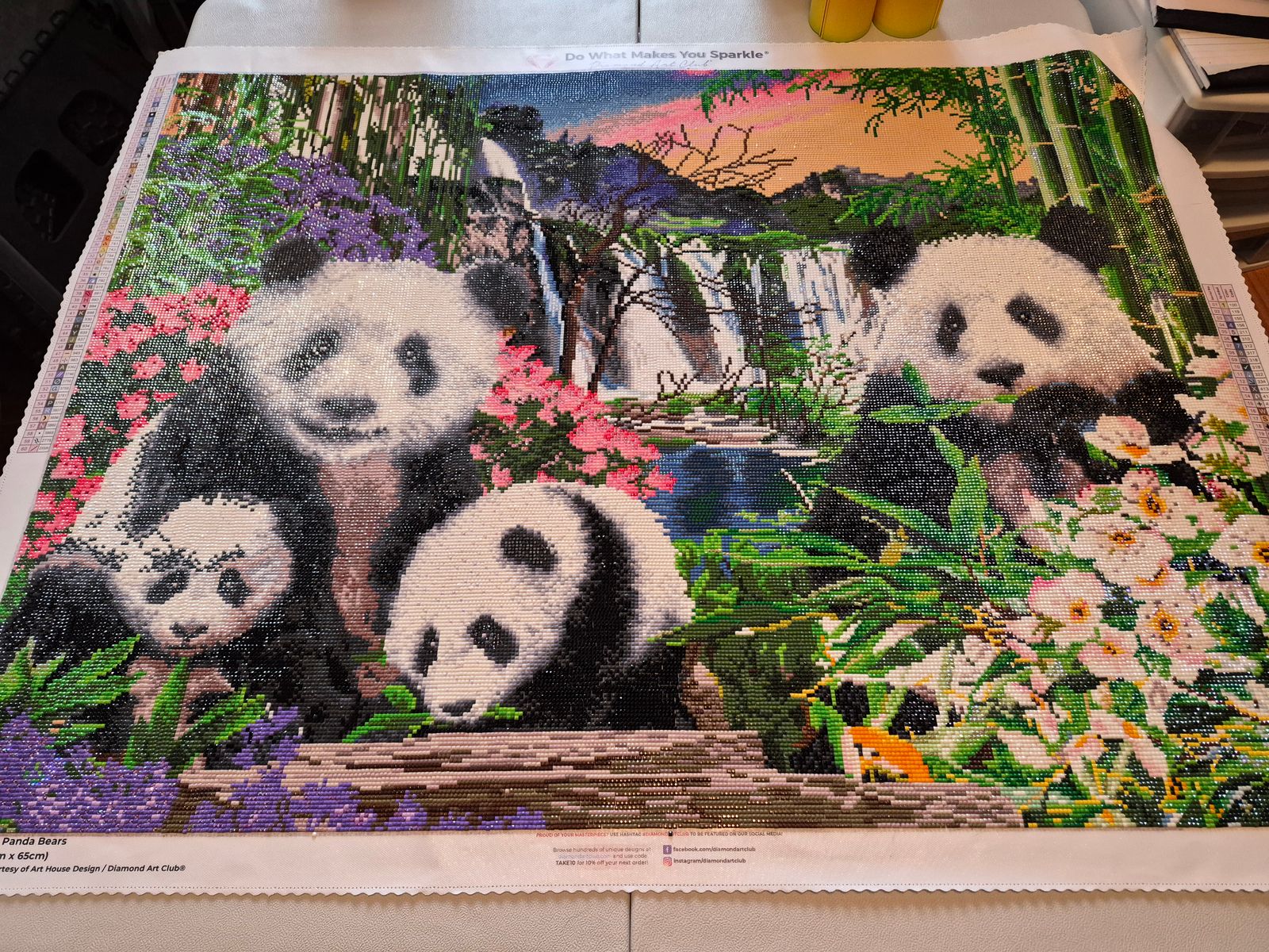 I worked on this project for my Mother in law. It was really nice to work on. The grid was perfect, no significant gaps. The colors are vibrant and even though there is a lot of black and white it still sparkles fantasticly in the sun light. We put it in a bamboo frame, it looks so nice! 10 out of 10 highly recommend if you love Pandas!!