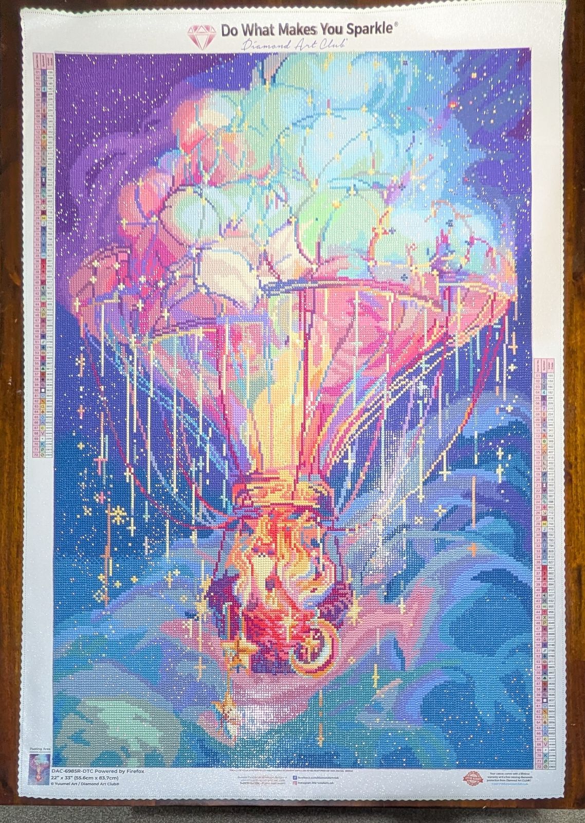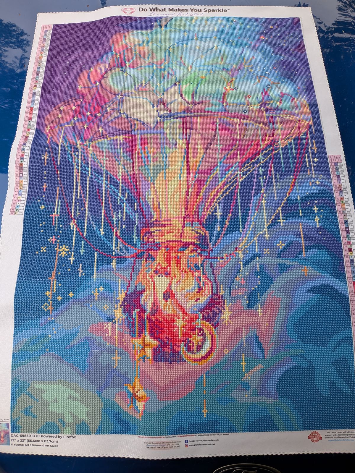 i am so happy i purchased this off my wish list when it restocked! the colors are SO bright and beautiful in person. i love all the different hues, there is such an ethereal vibe. this was a fun canvas to complete and went much more quickly than i had anticipated! i enjoyed the round drills, and how there was a good balance of color blocking the sky and confetti with the hot air balloon!