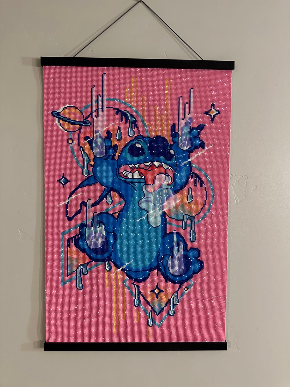 I did this for my 11 yo grandson who loves Stitch and wondered if the pink would bother him but it did not! I loved working on this and it did up super fast. Would absolutely recommend!