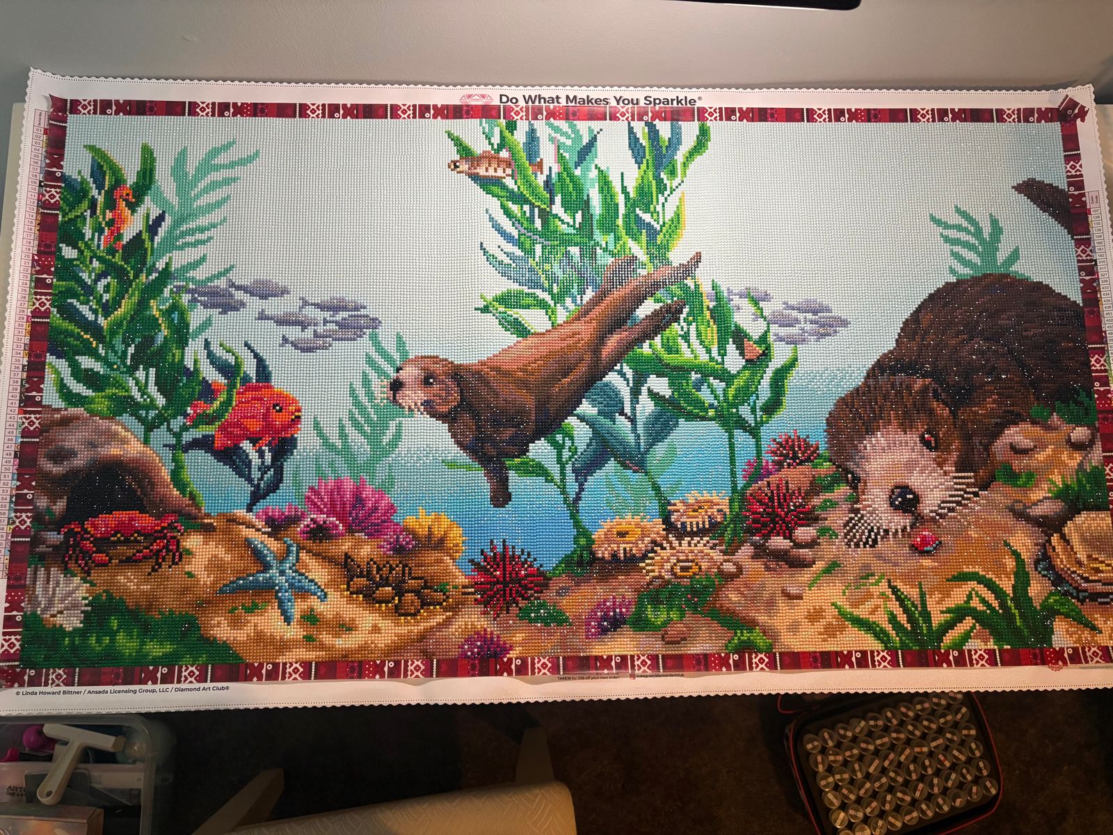 This is a cute kit for sea otter lovers. I did this one for our grandson who loves to watch otters play. This one is a huge, round drill kit. I would have preferred square but it did turn out really cute.