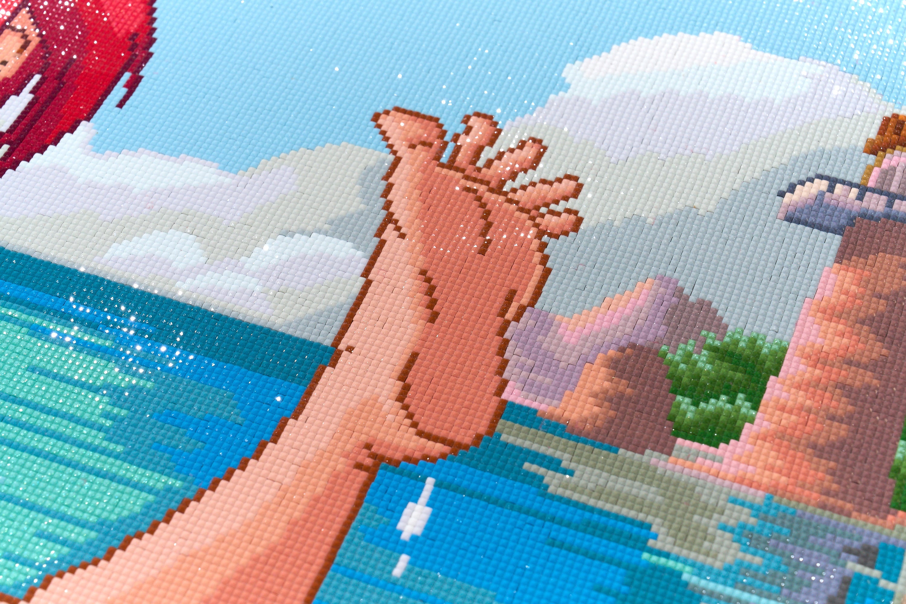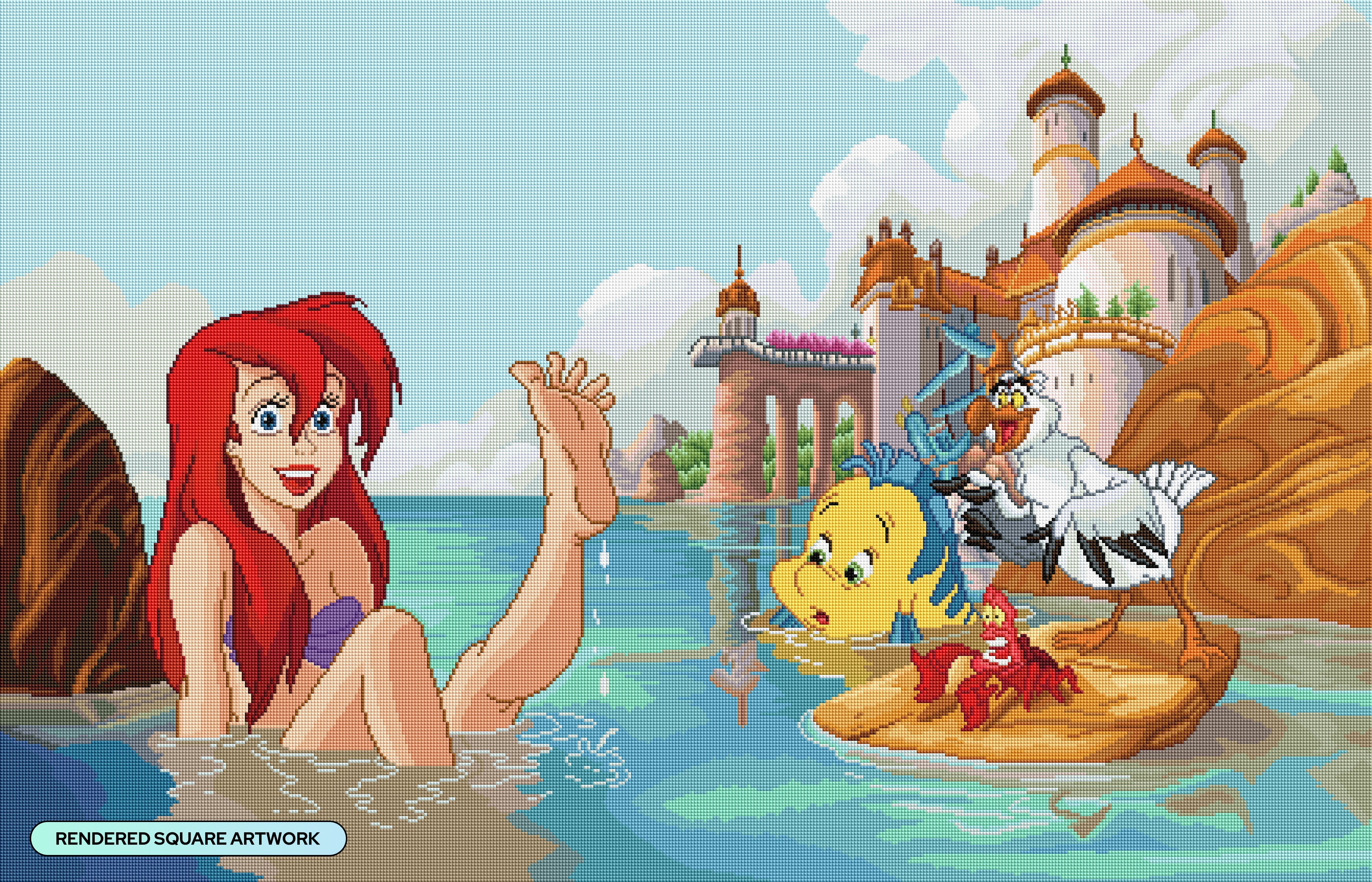 beautiful painting, ariels hair and flounder are fairy dust drills. certain drill colors have fewer facets (not a big problem) and 1-2 drill colors have a bunch of trash drills which is irritating but overall nice painting. do note it is GIGANTIC though