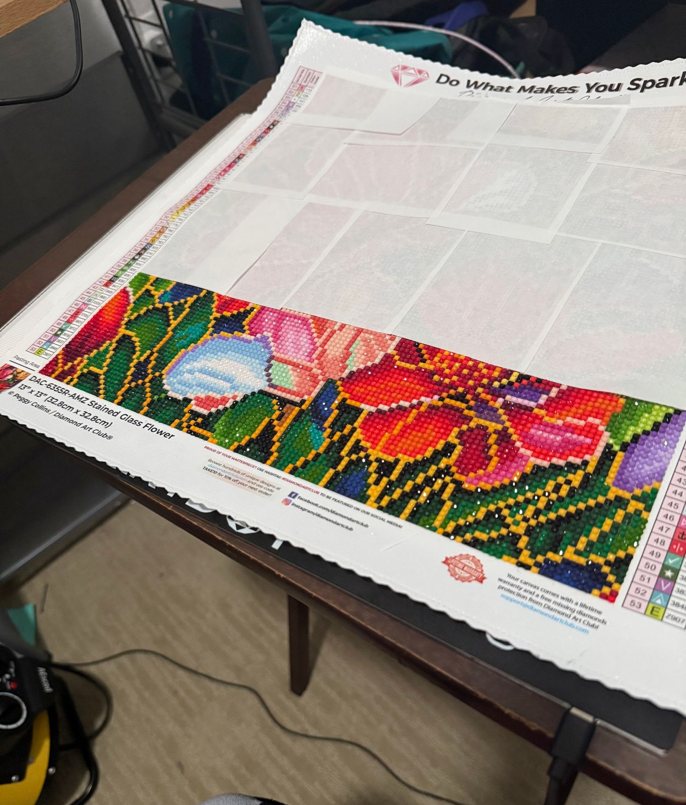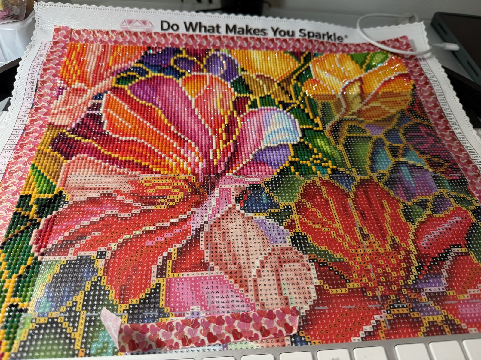 I’m glad this was a small one because I wouldn’t have finished it if it was any bigger. The glue was slippery and the drills had a hard time sticking, even after trying to resolve it myself with 2 different methods. The drills didn’t stick to my wax or putty so I’m not sure what happened with this one. But I love Peggy Collins and the piece is still beautiful.