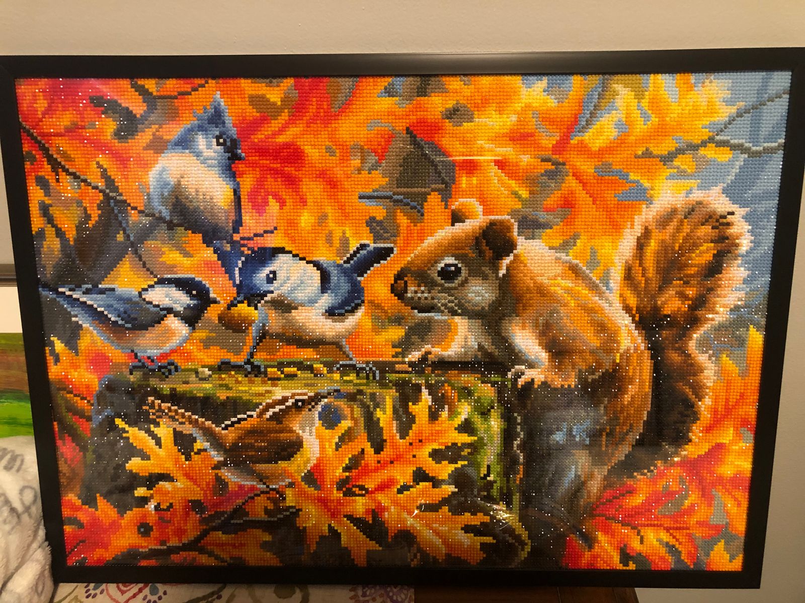 This is my 1st Diamond Art Club finish. I have many waiting to do. I thought this would be a nice size to do before moving onto some even larger ones. I found this to be fun and a bit challenging for me. The drills were lovely and I had plenty of all colors. There was very little trash. It has a beautiful shimmer to the finished piece. It's even more beautiful than I was expecting given I've heard such nice things about DAC. It took me a long time to finish 76 hours. I'm 100% sure that was given my lack of experience. I definitely recommend this one especially if you like fall colors.