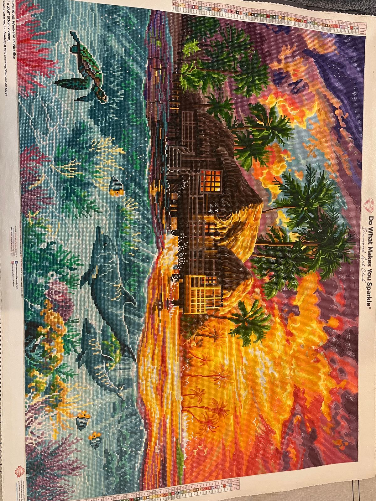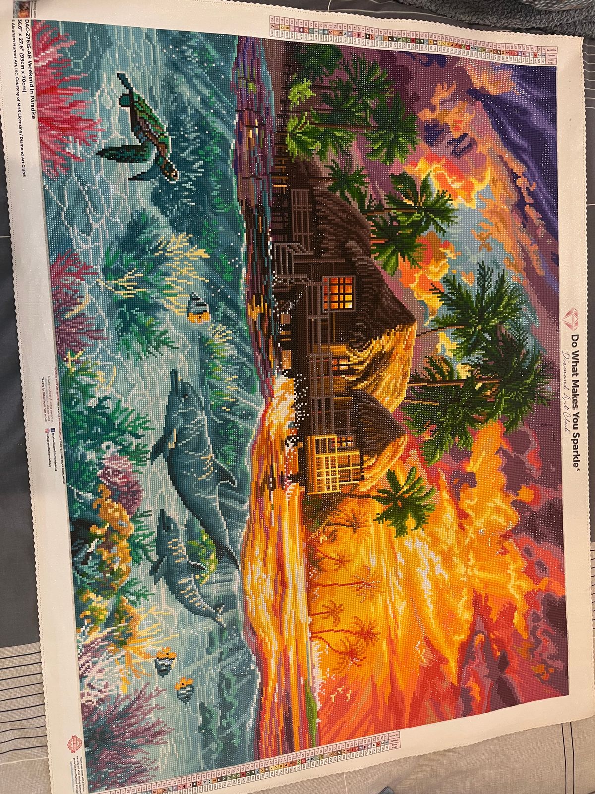 Weekend in Paradise es una pintura de diamantes verdaderamente espectacular. El diseño transporta a un paraíso tropical, con colores vibrantes que combinan perfectamente tonos cálidos y frescos, generando una imagen casi fotográfica. El lienzo es de excelente calidad, con impresión clara y adhesivo fuerte, lo que hace muy agradable el trabajo.