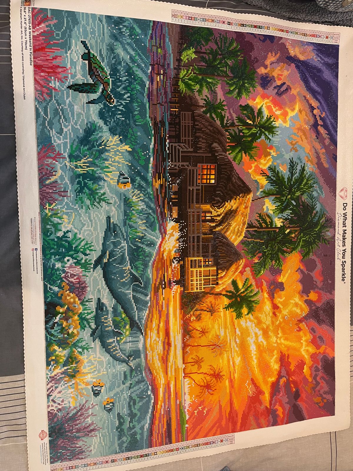 I recently completed this diamond painting and couldn't be happier with the result! The sky is a mesmerizing blend of purples, oranges, and yellows that perfectly captures a radiant sunset. What truly makes this piece stand out is the striking contrast between the warm sky and the deep, serene blues of the ocean below. It was a joy to work on, bringing a tropical escape right into my home!
