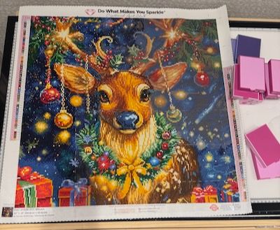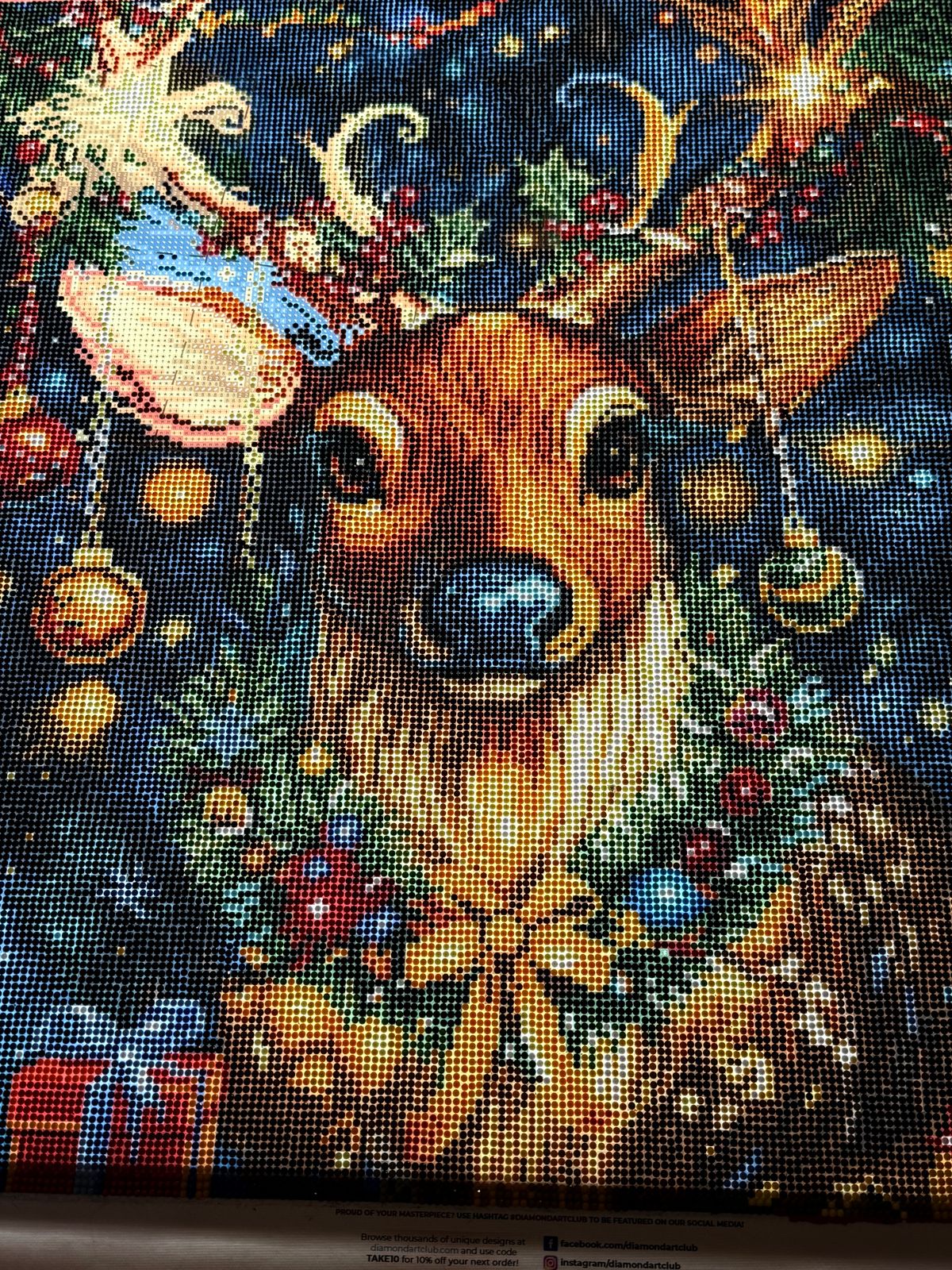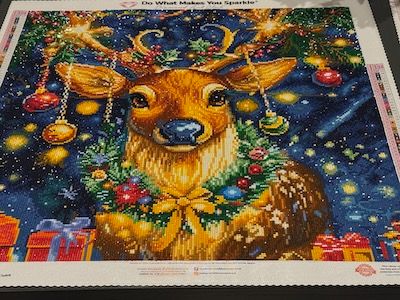 Blitzen is nearly done and the colors/details are gorgeous, but a few areas had weak adhesive. Because of that, diamonds came off easily and I had to keep re-pressing/replacing them.