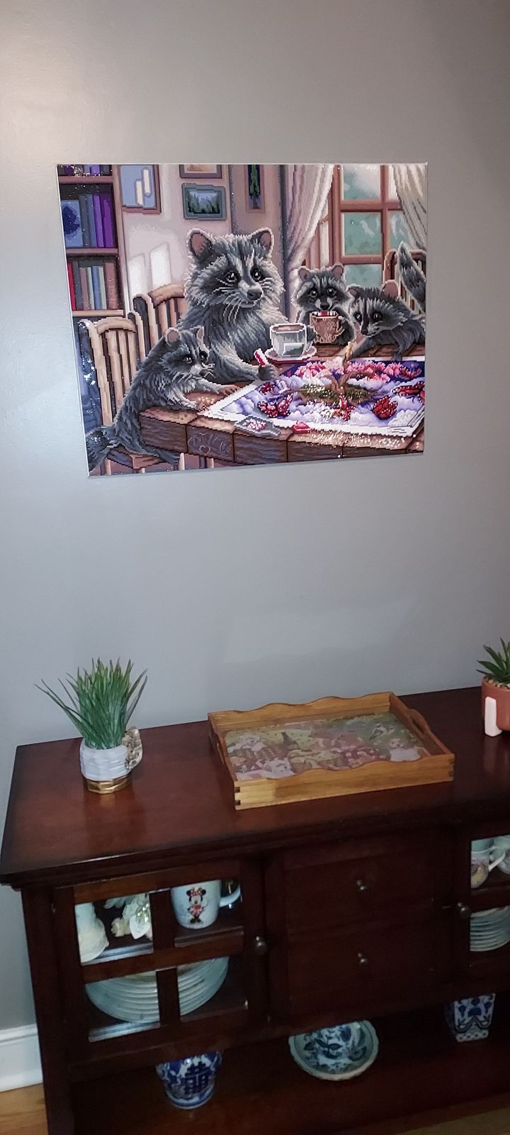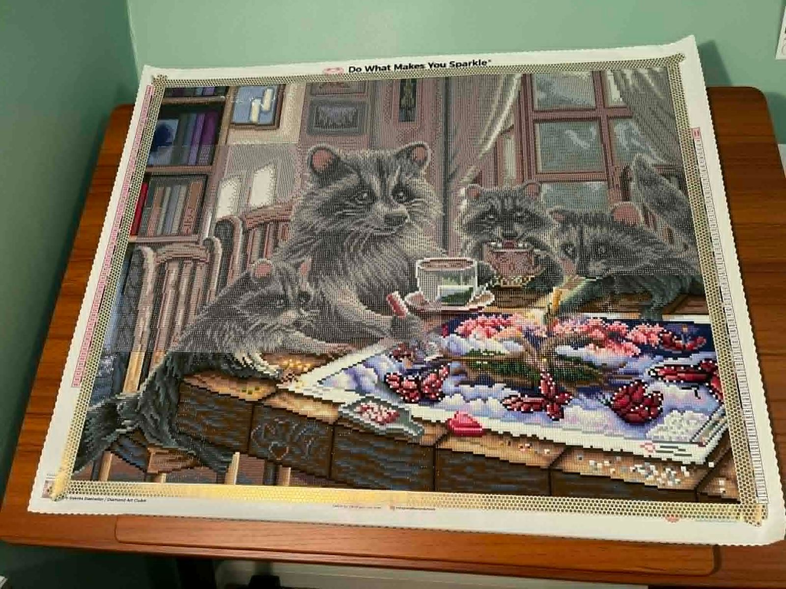 This is my current WIP. Definitely a confetti heavy piece, but there are a few color blocking areas as well. Its super cute and I love the details. There's even a color key on the canvas the raccoons are dping.