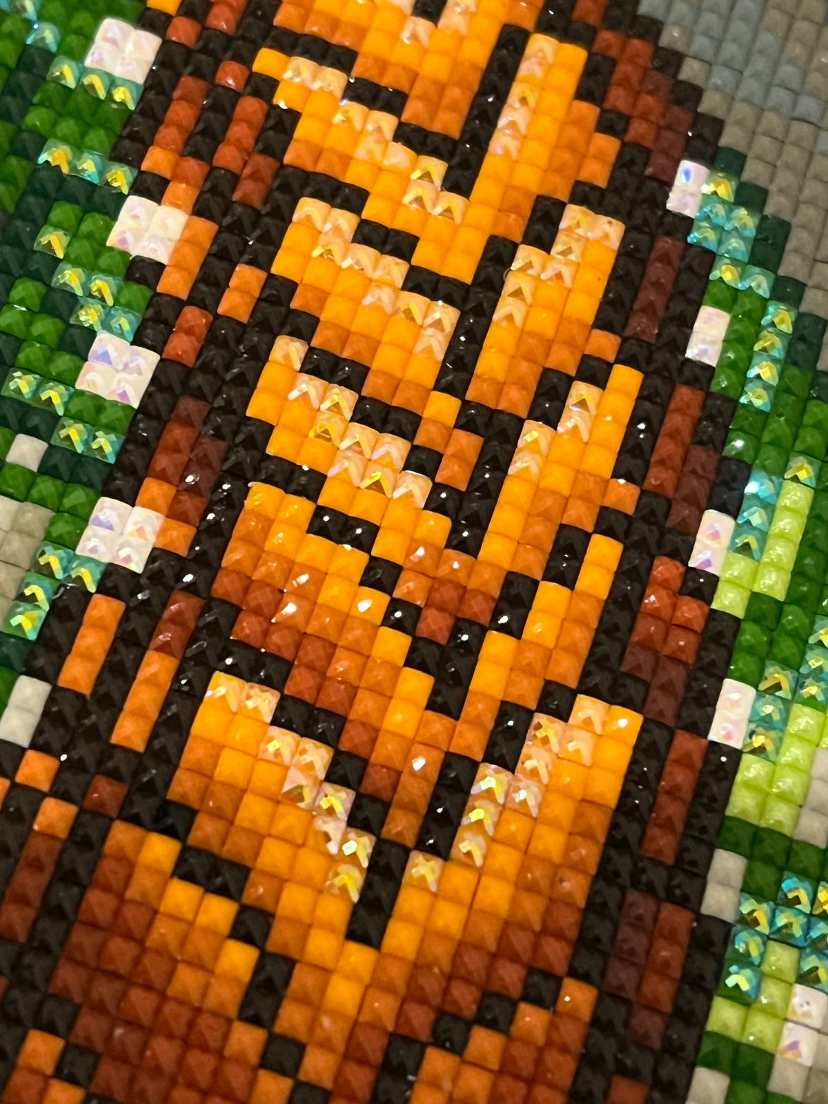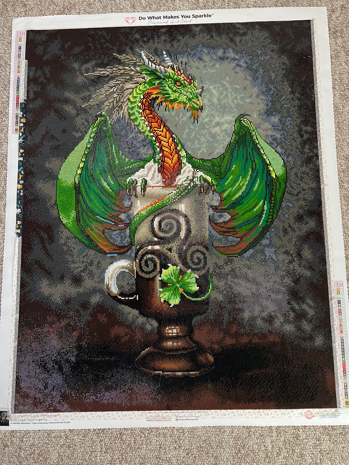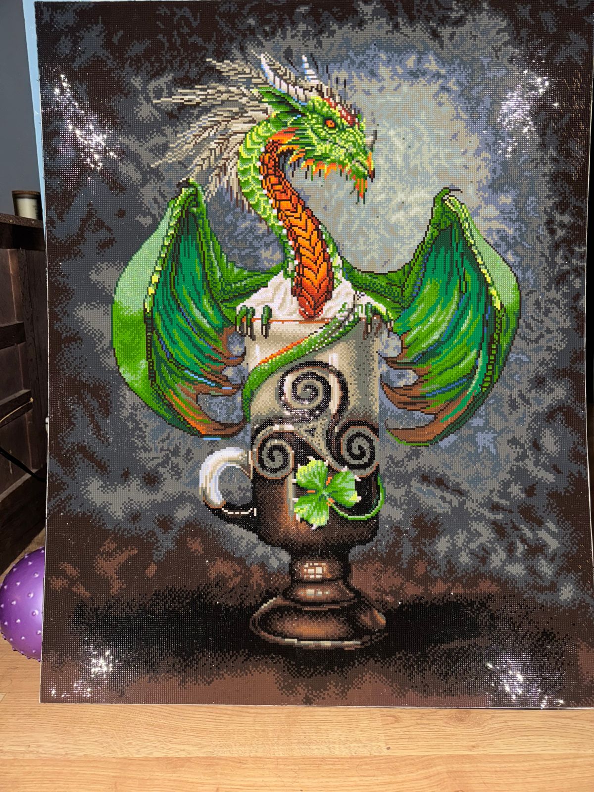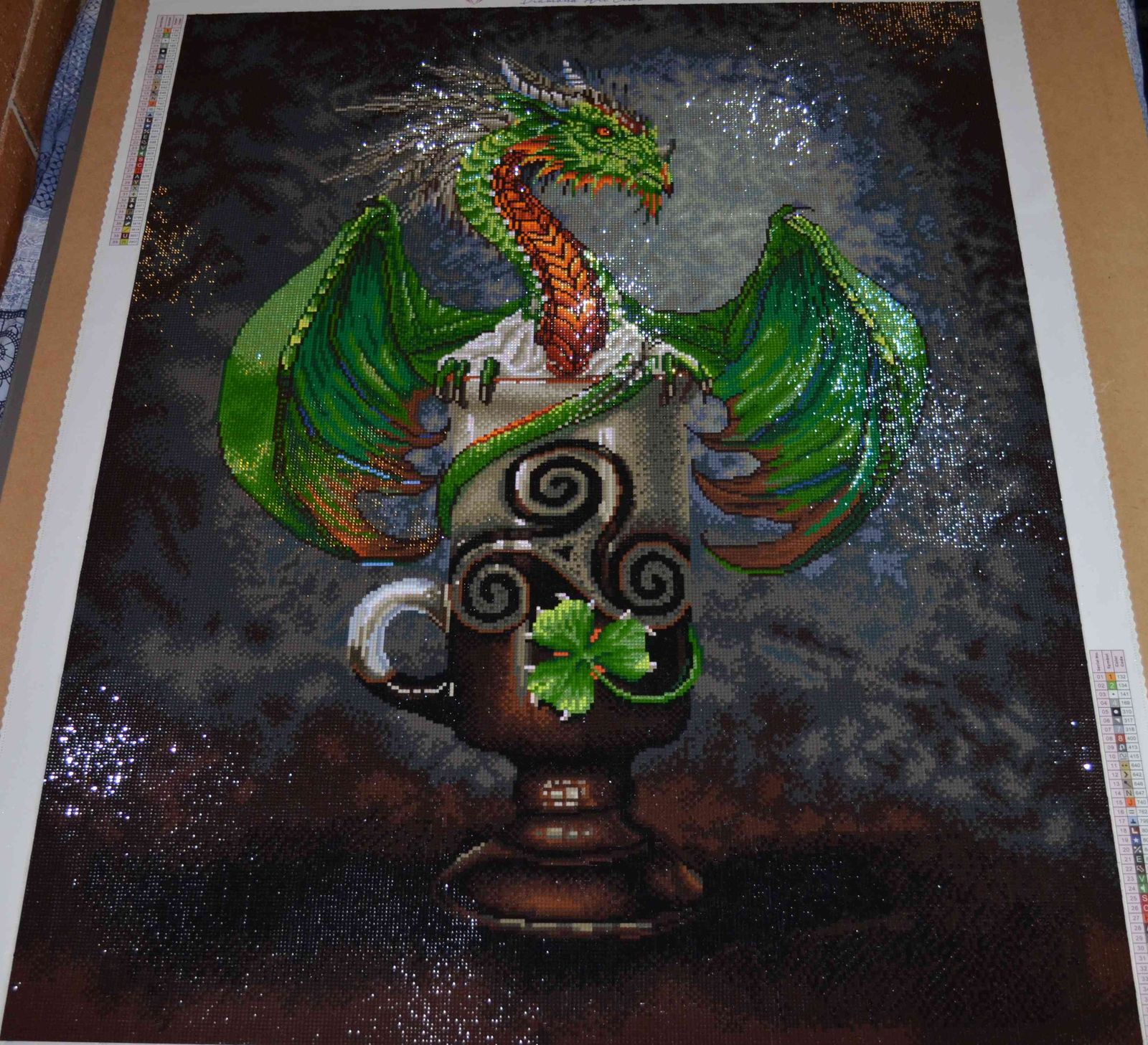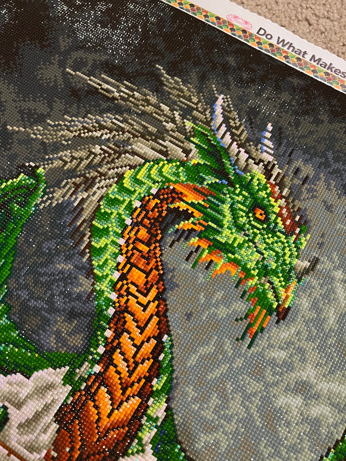 Love the finished image of this one, the dragon colours pop out so much against the dark background. The canvas, drills and glue were all great. There was quite a lot of colour blocking, so that helps with the completion time. The only thing is be prepared for the size and that dark background. I confess as a "me" issue it did take a bit out of me, however the end product was well worth it. I think if you go in prepared it will be ok, so I would definitely recommend this kit.