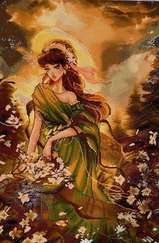 Meander through grand meadows, gathering wild blossoms by the basketful. A golden halo brings a warm luster to flowing green robes and a rapturous sky.