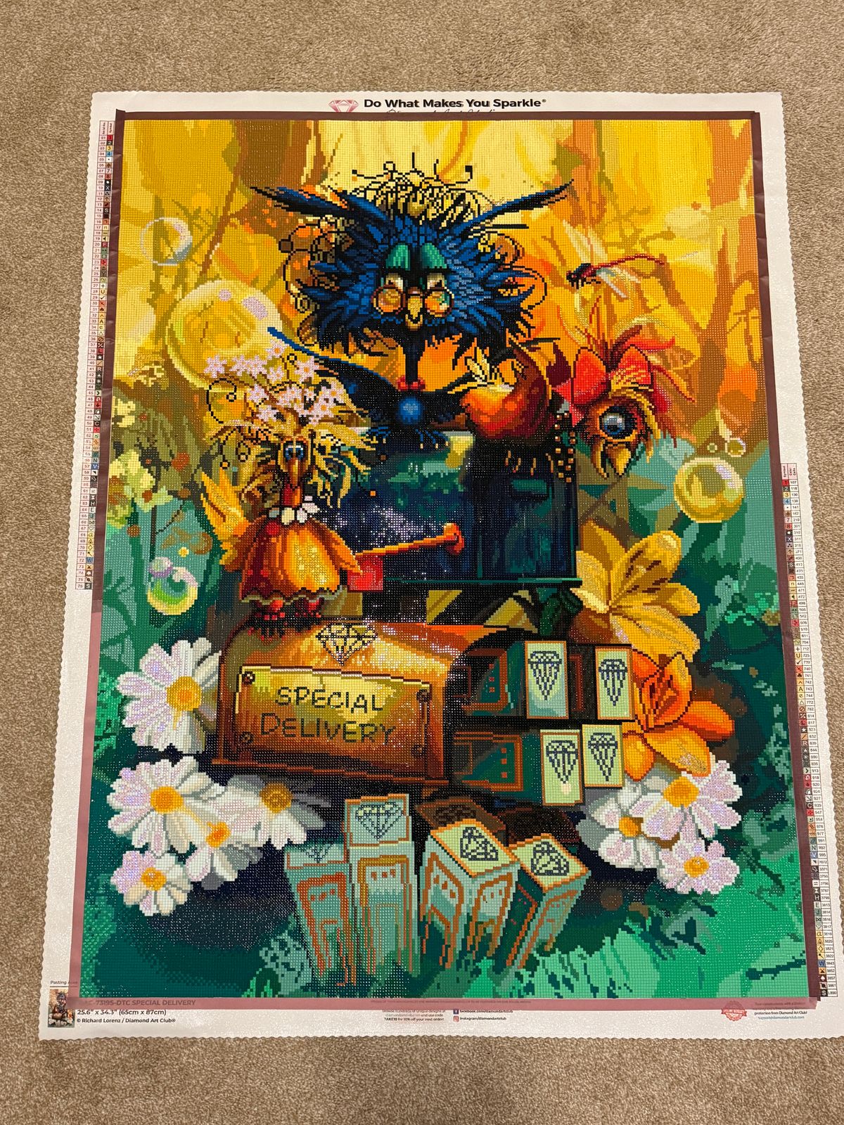 I was so excited to see the rendering of this diamond painting of Special Delivery by Richard Lorenz, it is so colorful and gorgeous and it totally expressed the joy that I get every time that a DAC ORDER is delivered right to my door in days!! Can't wait to start this one after I have finished Richards Bird Mojo that I have finished halfway already . It has been a joy for me to work on!