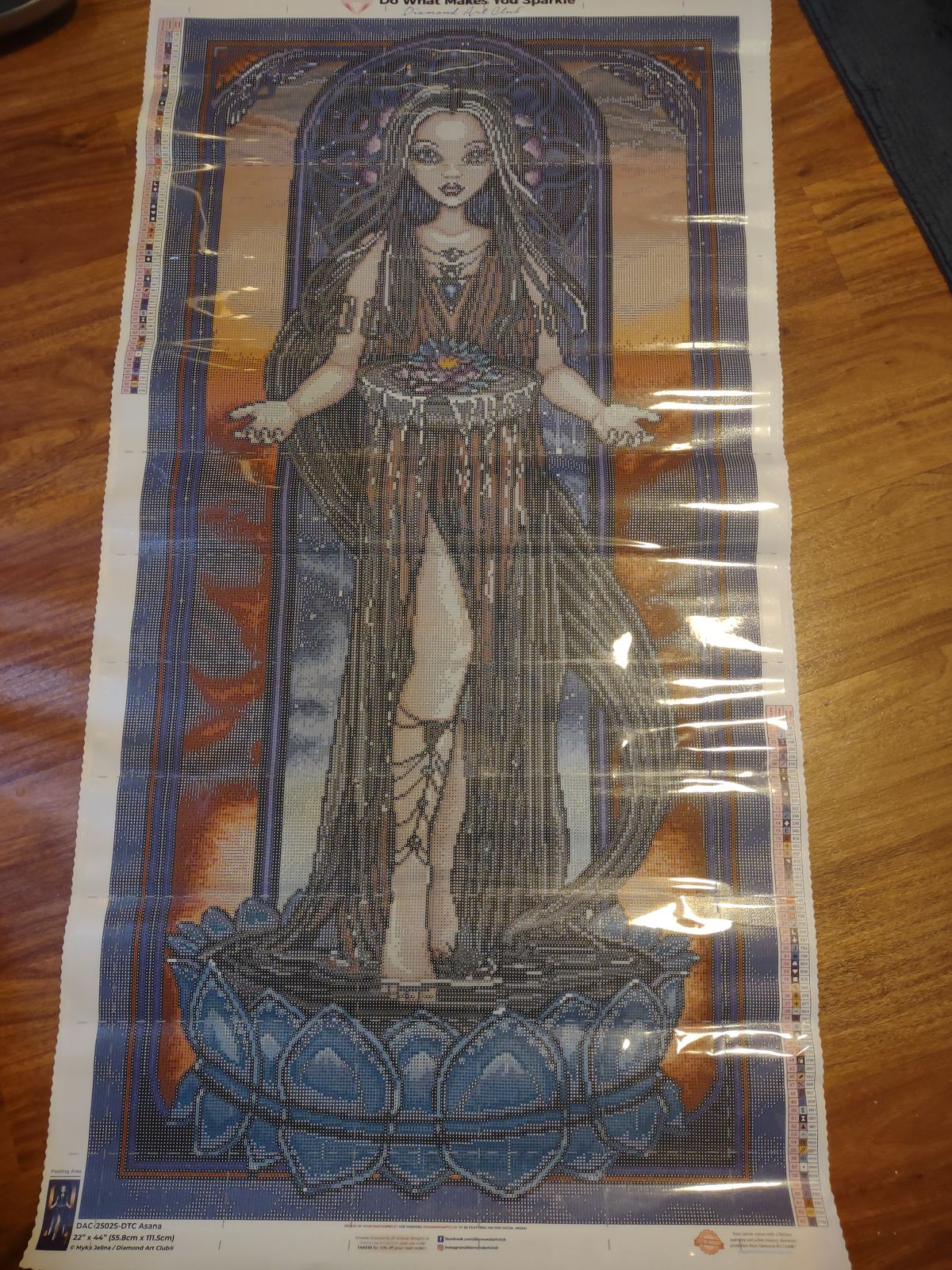 Largest diamond painting I’ve attempted so far., and I’ve done many. Just started working on it. Absolutely gorgeous. Going to take me probably a month to finish. Average 4 hrs a day. Gave it 4 stars because box was crushed and canvas crushed too. Hope this comes out flat when finished. Also, notice very little glue where perforation in film . I suspect air may get into tiny spaces and dry out glue. Otherwise, cant wait to see finished product. Asana is beautiful!