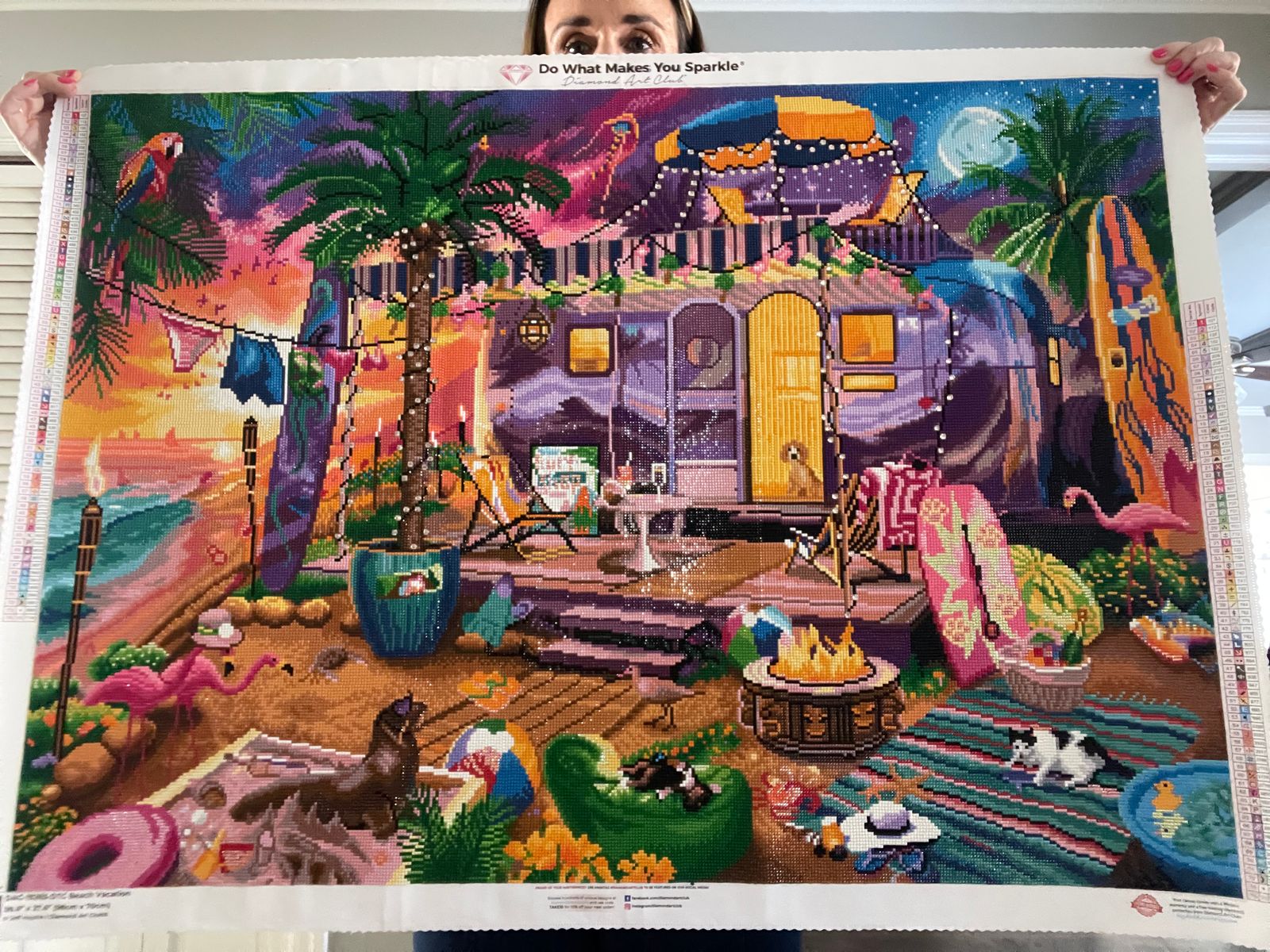 This painting was so much fun to do! The string lights (special drills) really make this pop. I liked all the little “treasures,” too … like the flamingos, the bathing suits, the moon, and more!