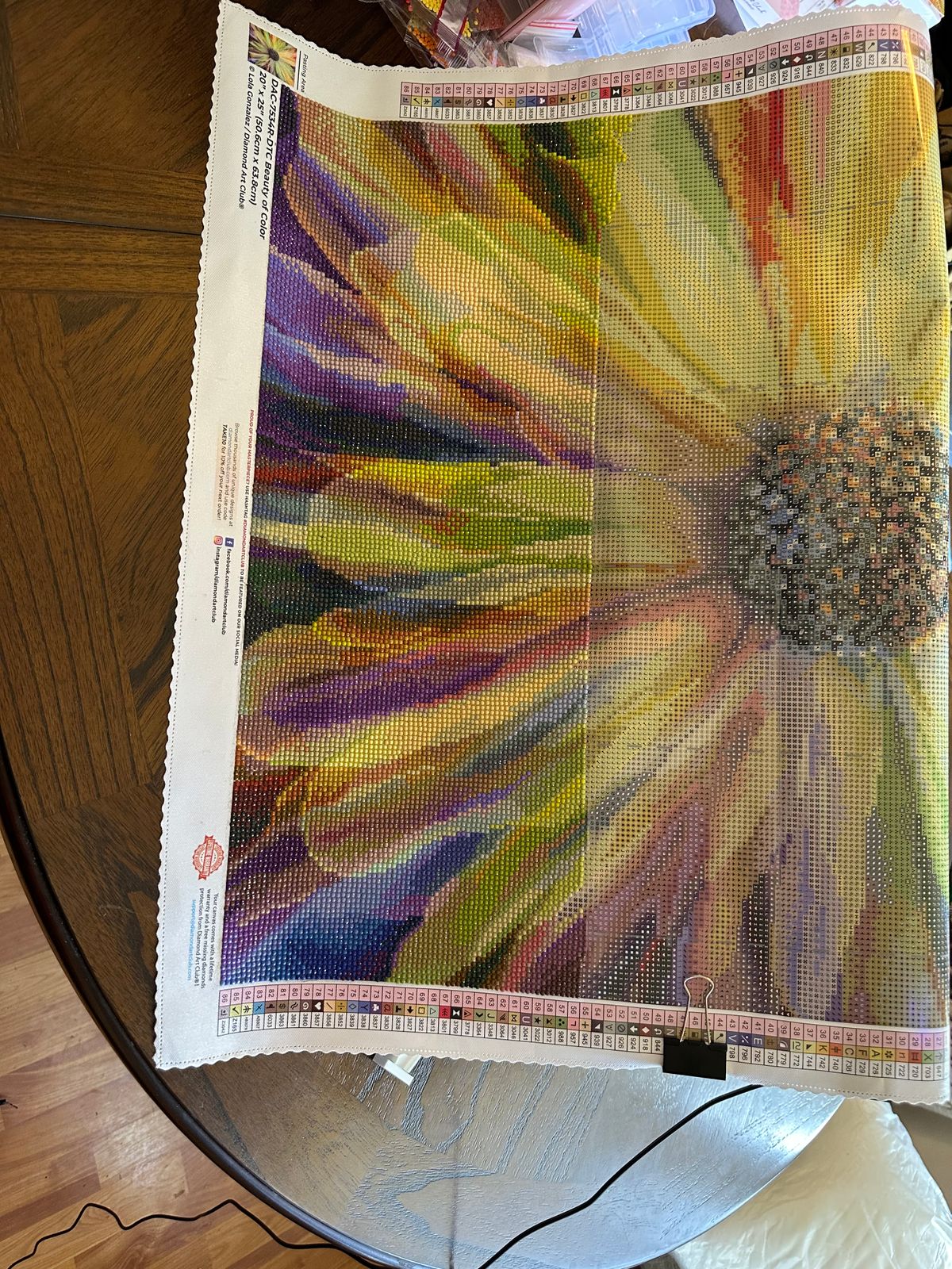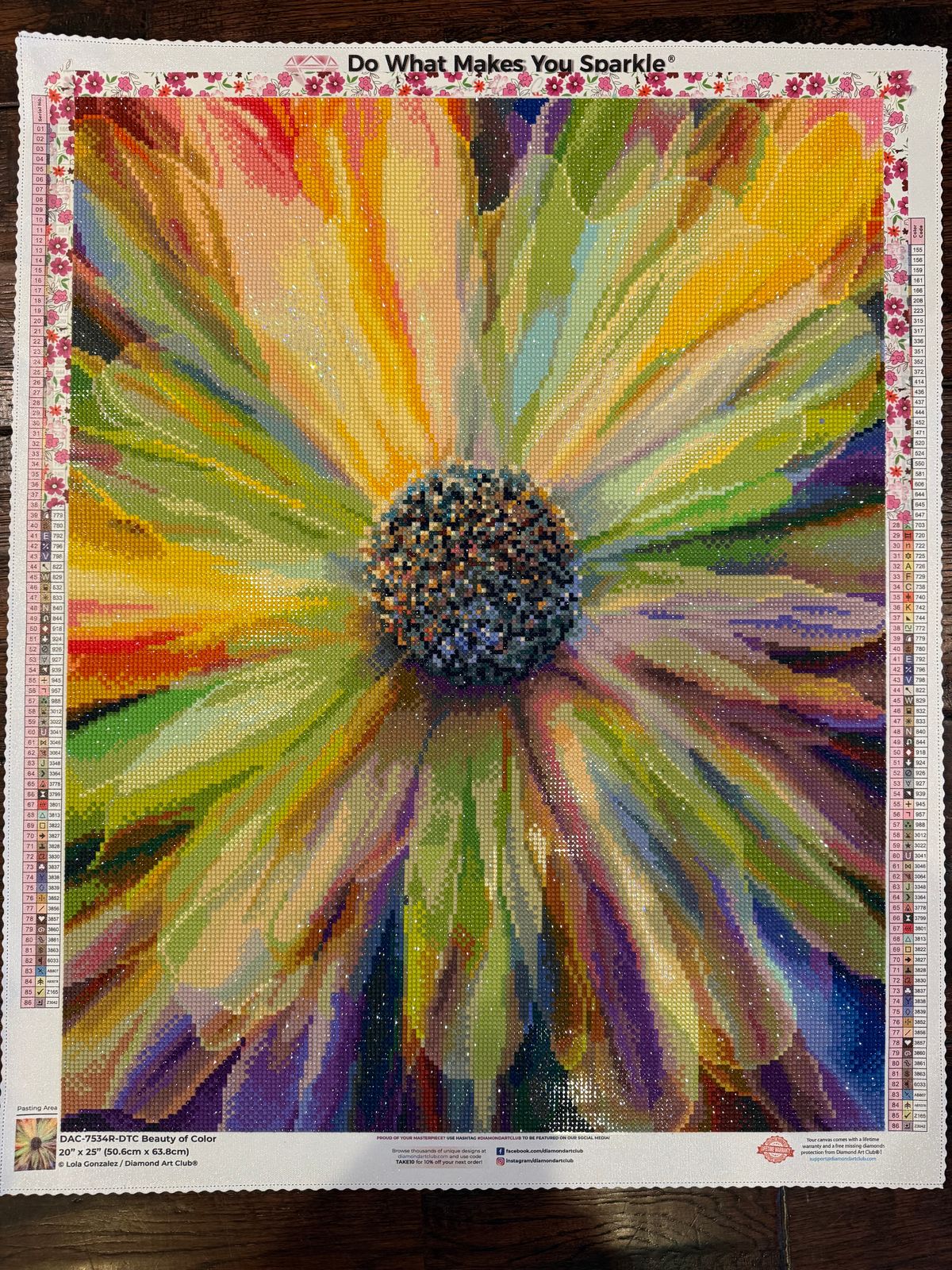 What an amazing DP to work on! The photos don’t do it justice! The colors are so vibrant…the drills sparkle and shine! I love all DP canvases by Lola Gonzalez…her single flowers are my favorite. This is my 5th DP flower to complete from her DAC collection. The new and improved grid is easy to work with and all the drills line up nicely; no need for a ruler! I highly recommend this DP to everyone!