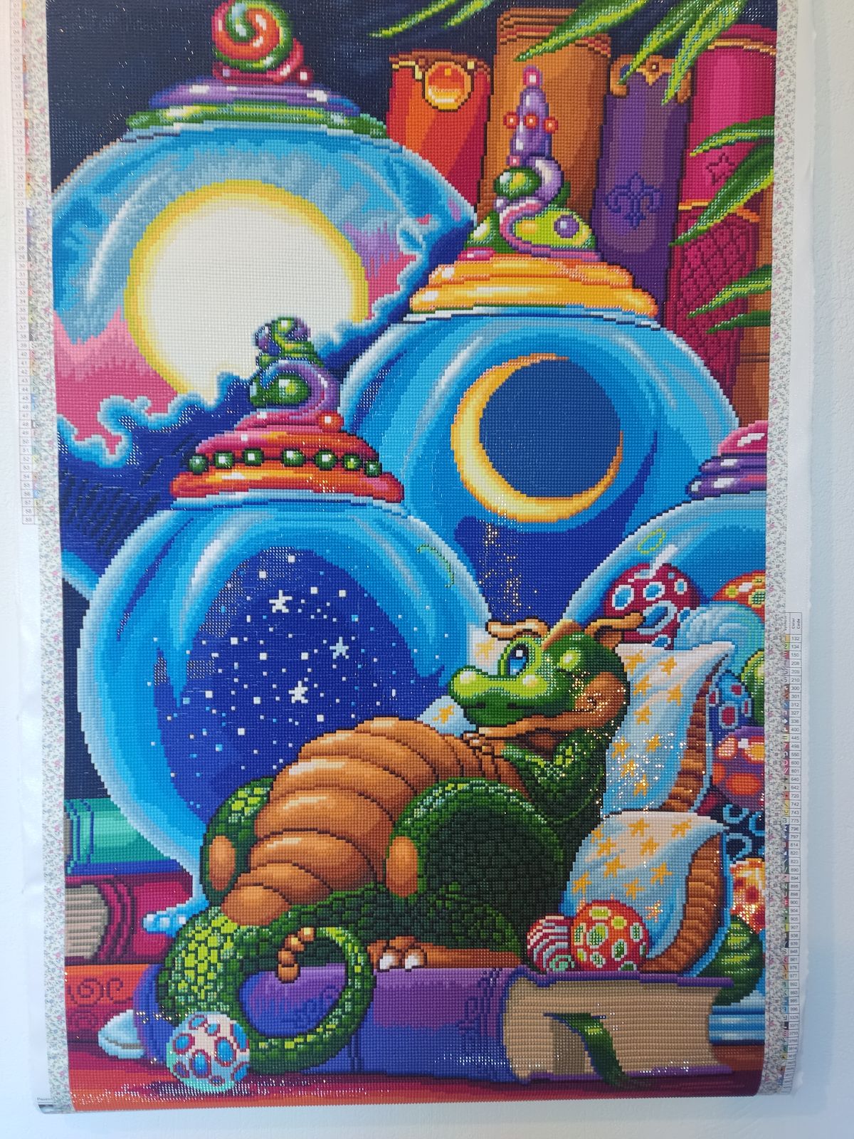 Plump up a few pillows and join this little draglin in some bedtime wonderment. Surrounded by such fascinating paraphernalia, you're sure to dream about glowing, glass vessels full of stars, suns and moons and the secret mysteries of the universe within them.