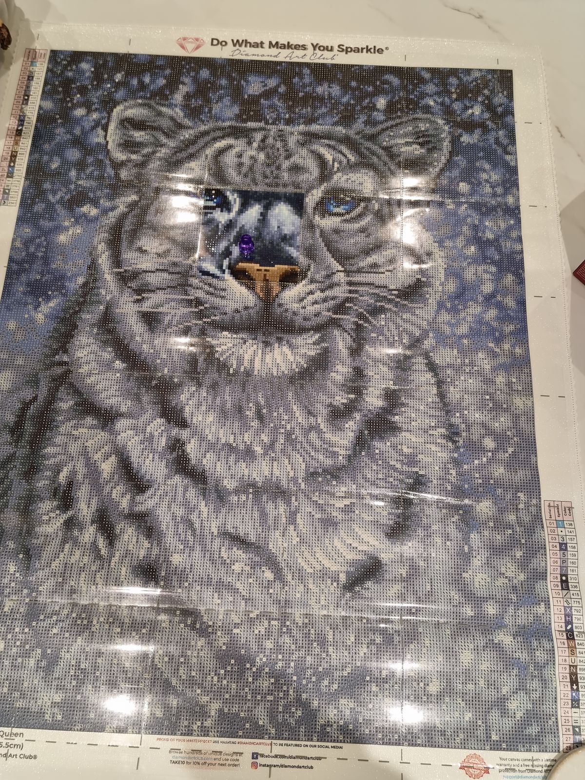The shipping was fast. Canvas look great. The legend is readable and also on picture. Drills look great. Just an adorable canvas of a snow leopard