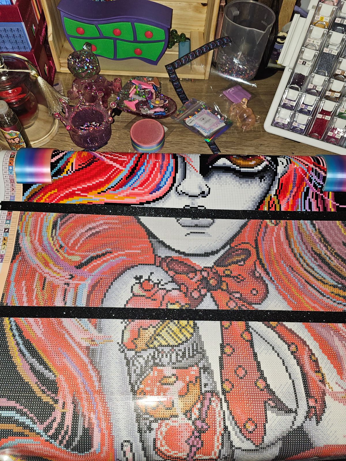 I've loved doing this piece from beginning to end. There wasn't a lot of color blocking, which was nice. It has a lot of confetti bc it's so colorful and bright,which I LOVE!! The only thing I would change is more special drills lol, you can never have to much sparkle💖💖 Another great one Diamond Art Club