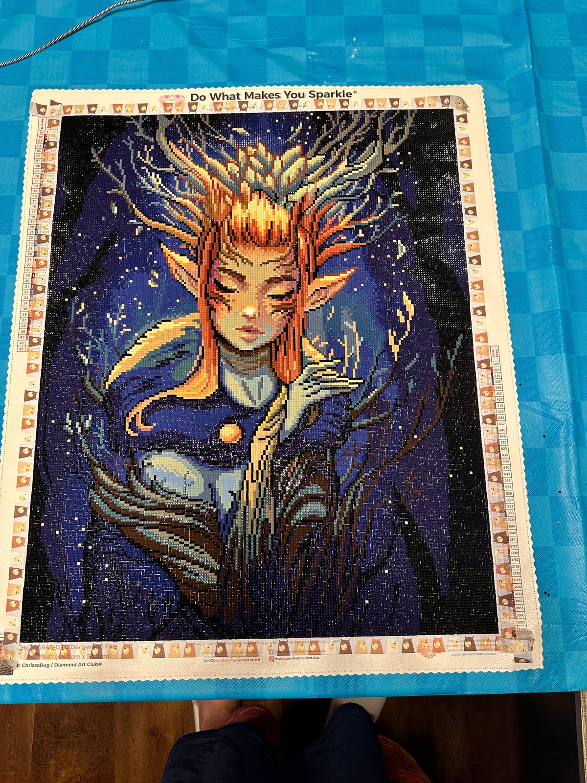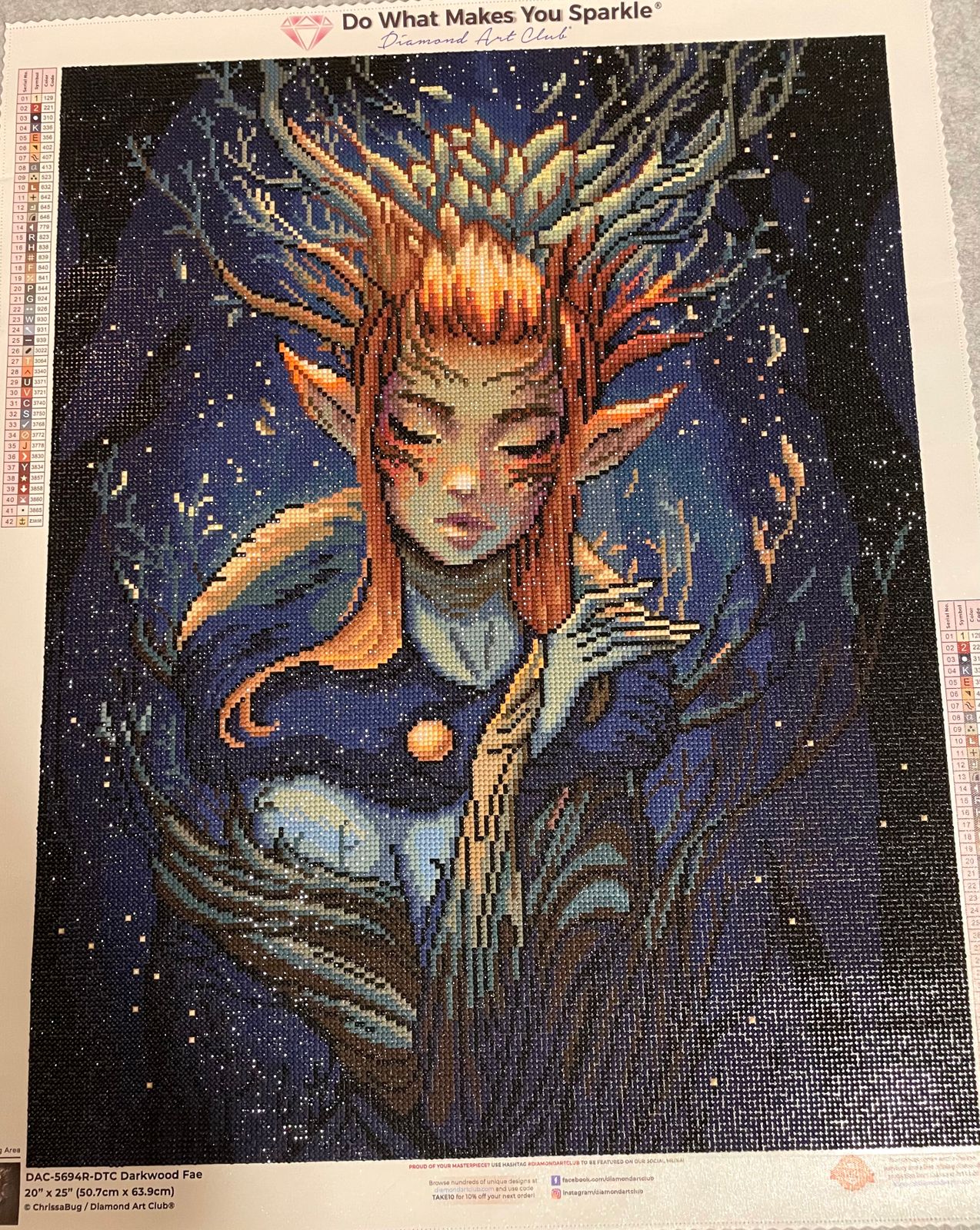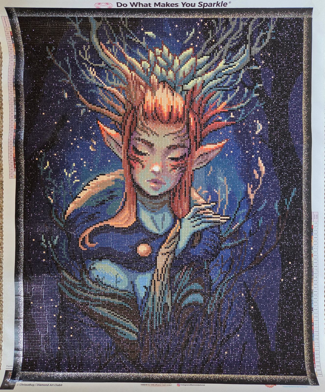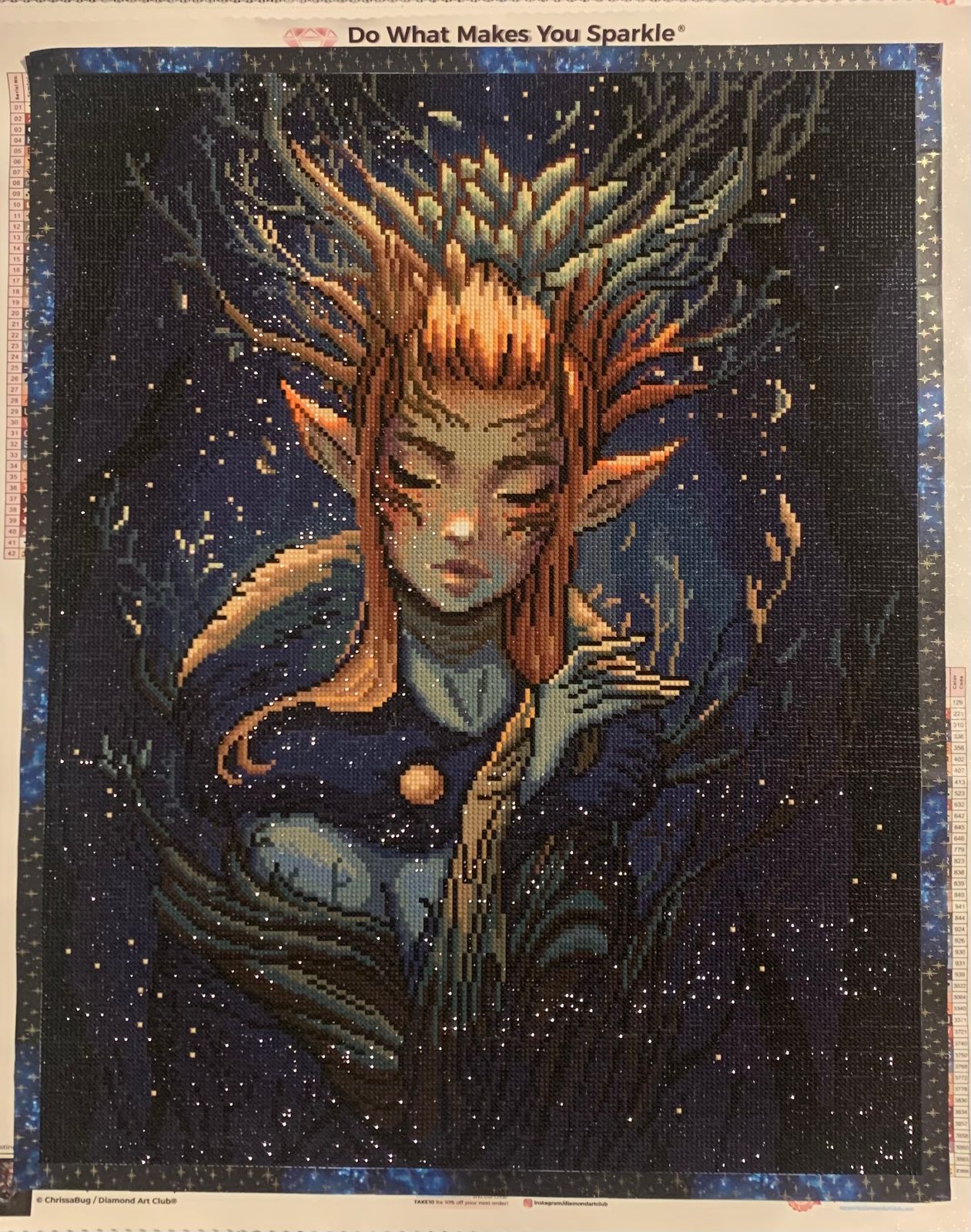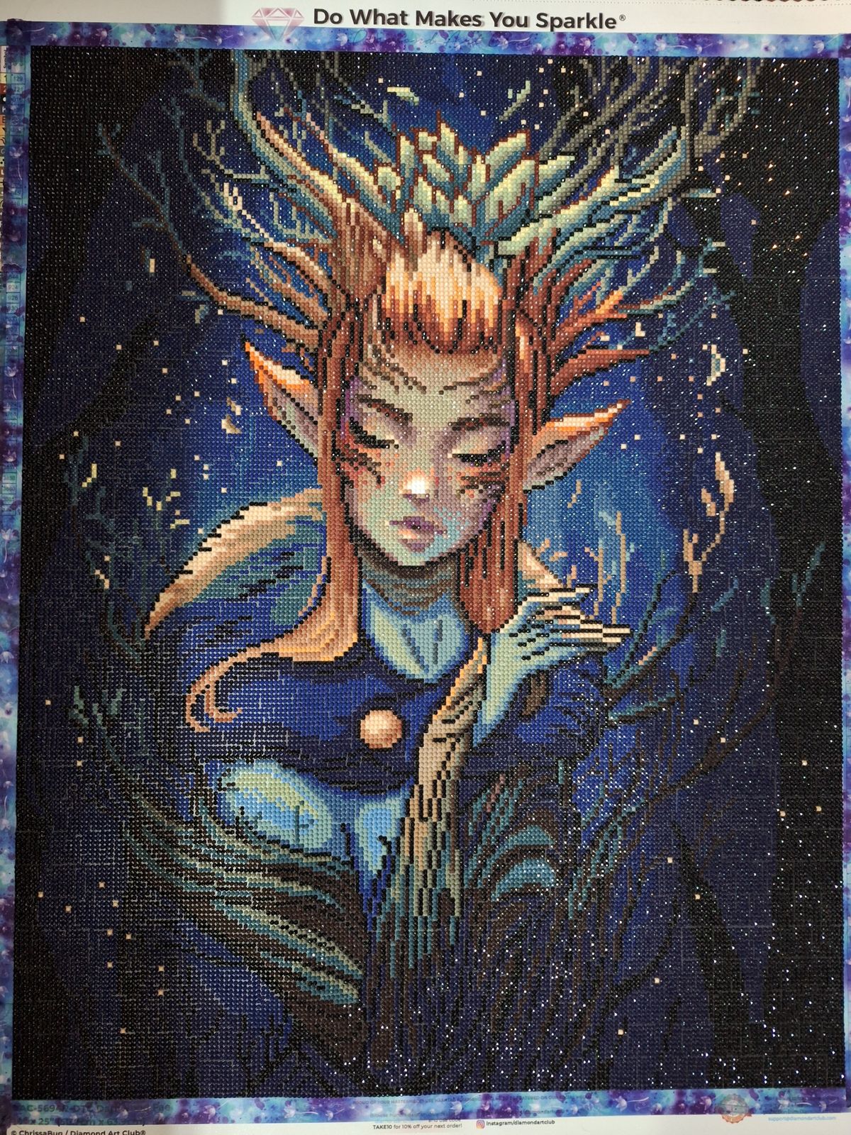 The art is beautiful and the round diamonds make it go really quick! The dark colors are not daunting and it doesn’t get repetitive. His/her face is gorgeous!