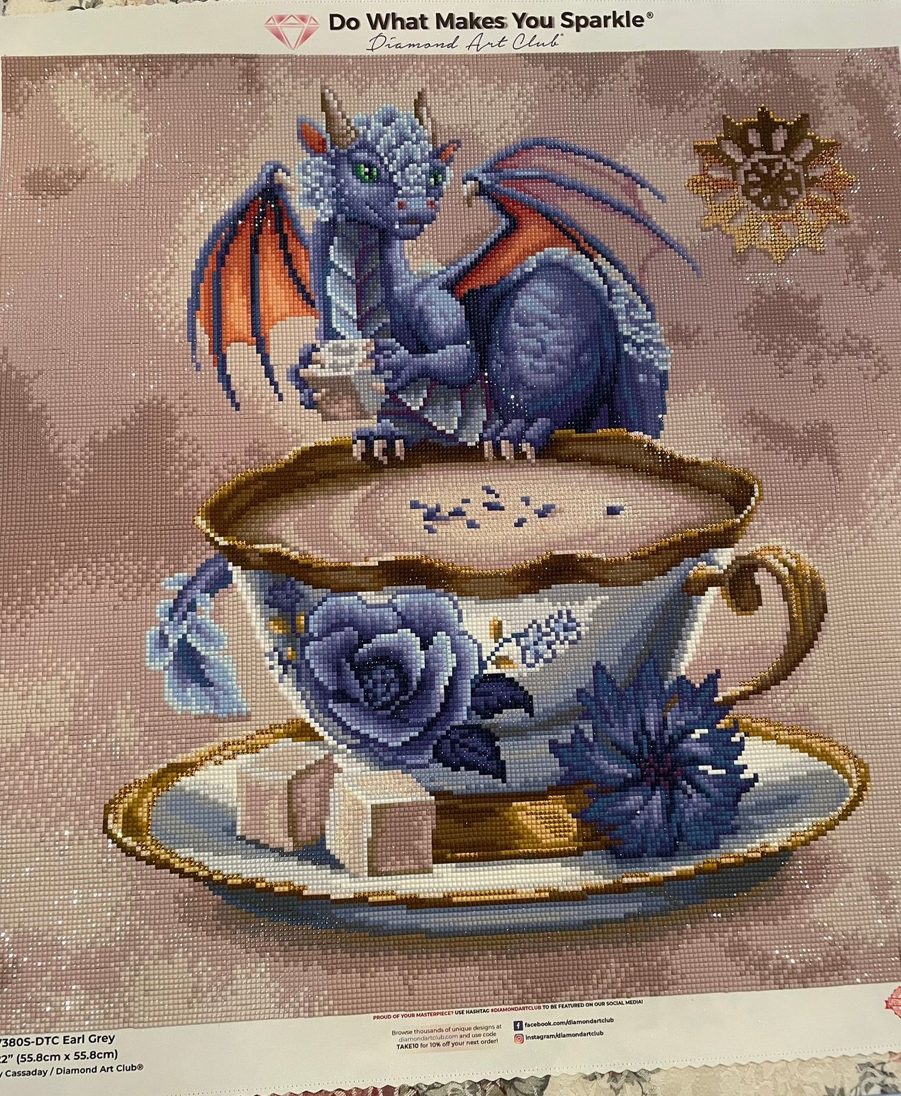 Earl Grey is cute but the canvas was so annoying. The stickiness needs much improvement. Some spots were so sticky, diamonds were difficult to straighten. And these cover sheets have got to go. I need to roll my canvas to store away when not in use and these cover sheets have no give whatsoever. So, rolling is nearly impossible and you have to pull the cover off so it will be able to roll and unrolling just causes curling. So, between these issues, finishing this canvas couldn't come fast enough and I'm dreading any DAC canvas I have in my stash.sent