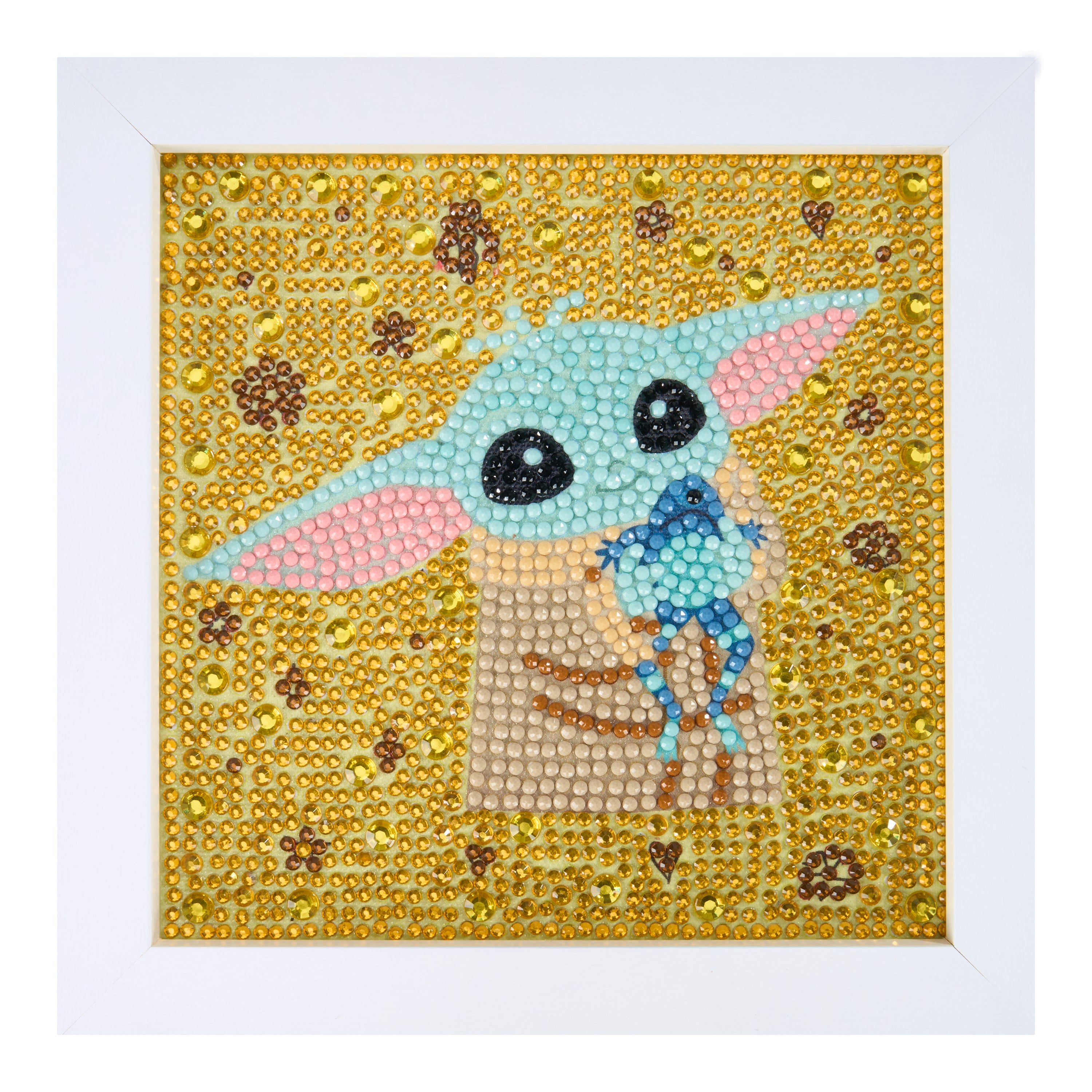 Capture the sweetest moment in the galaxy with Grogu holding his tiny friend. Each shimmering detail makes this starry cuddle feel even more heart-melting. The included white frame stands upright on its own and also features a built-in metal hook on the back for easy display however you like.