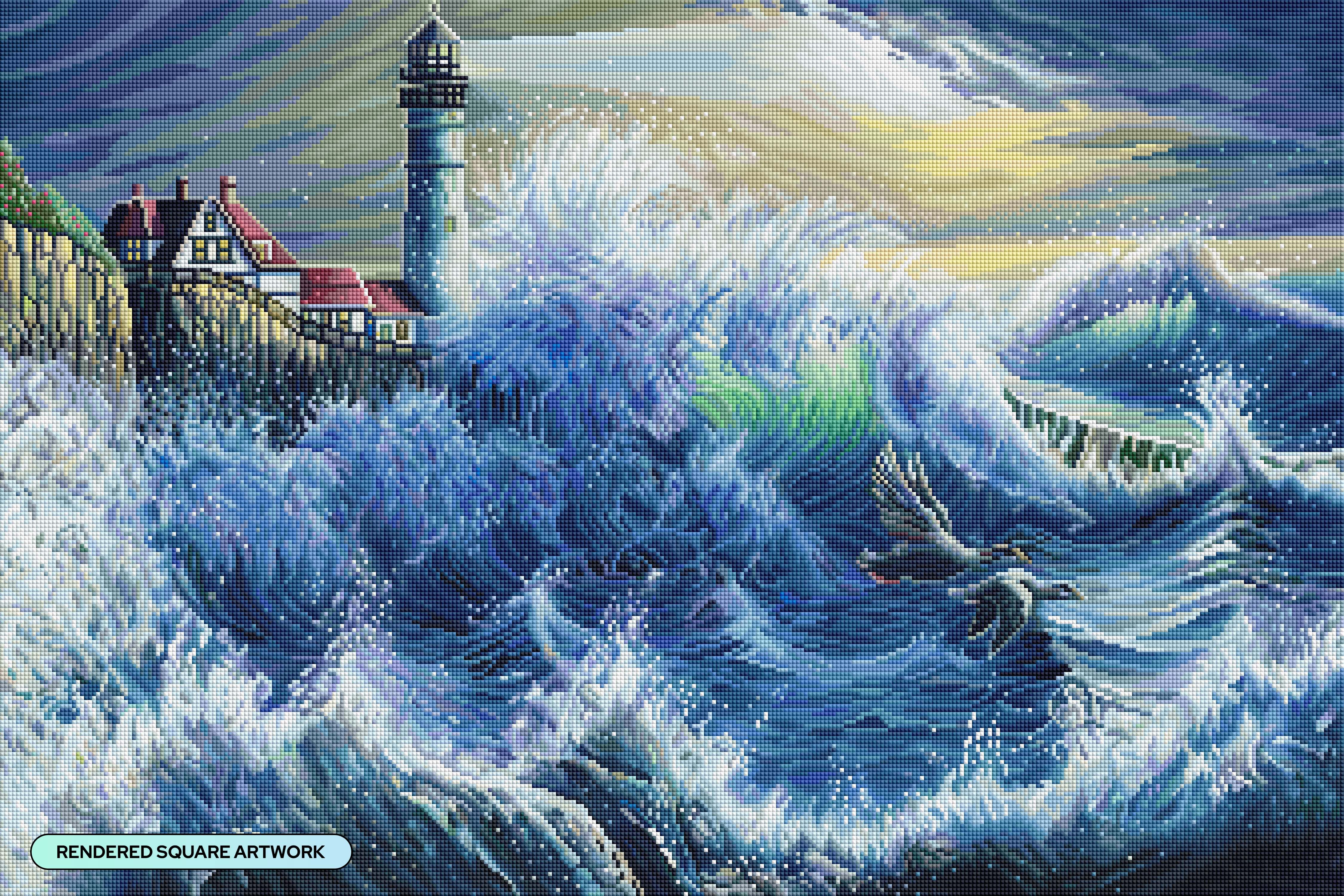 Watch the storm crash as waves rise high, crowned in froth and fury. Feel the wild rhythm of sea and sky collide, while a steadfast beam illuminates a path of resiliency.
