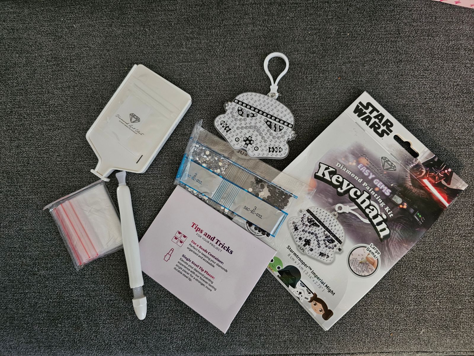 Even if my husband does diamond painting with me, I had to make this one for him. I liked this small and fun project. They have small plastic films on both sides protecting the glue. I had enough gems for both sides and even had some leftover.