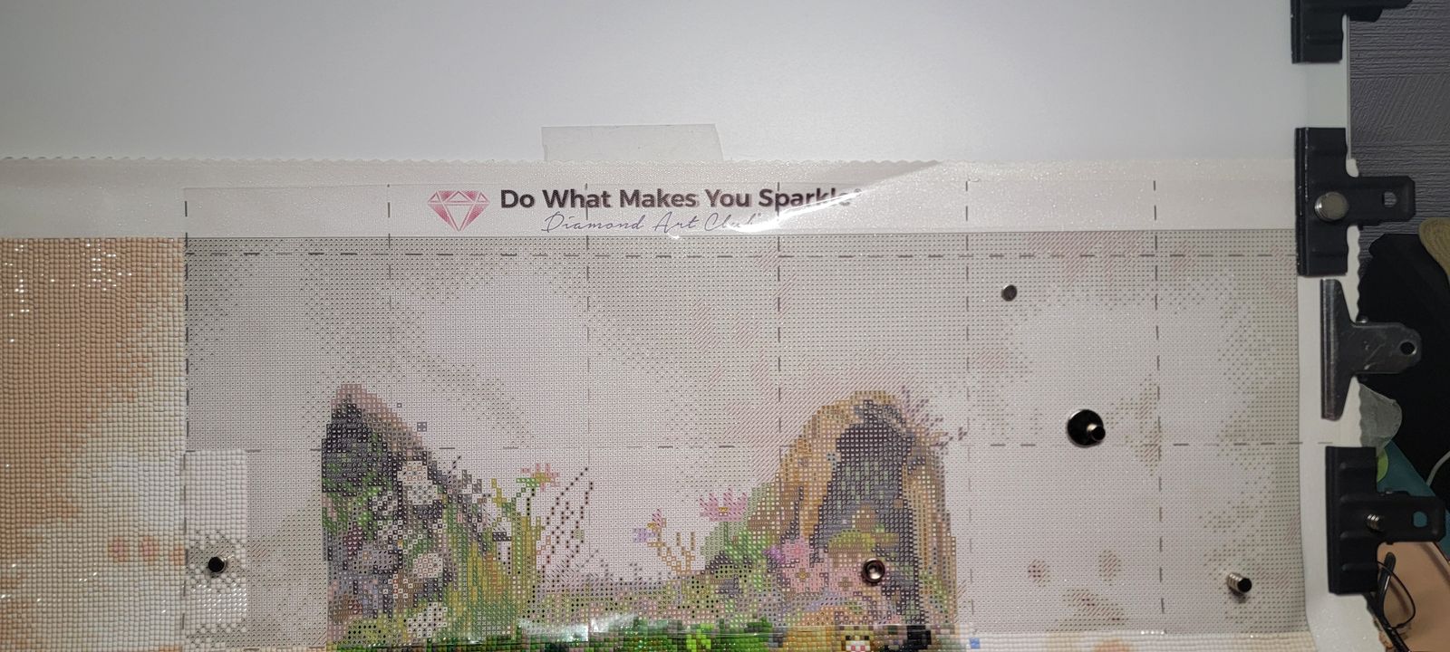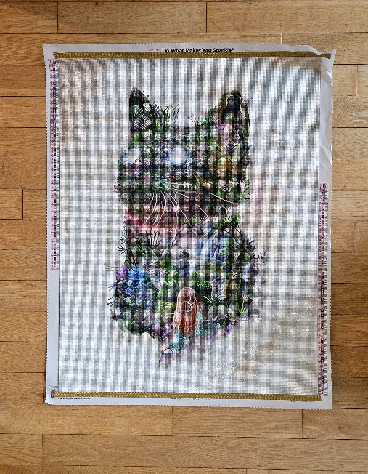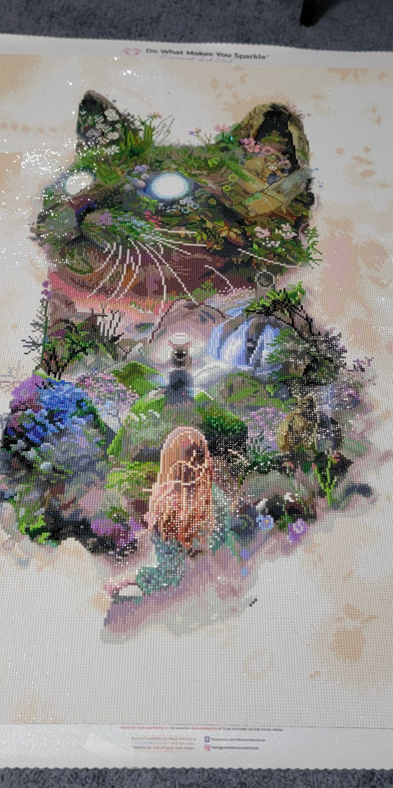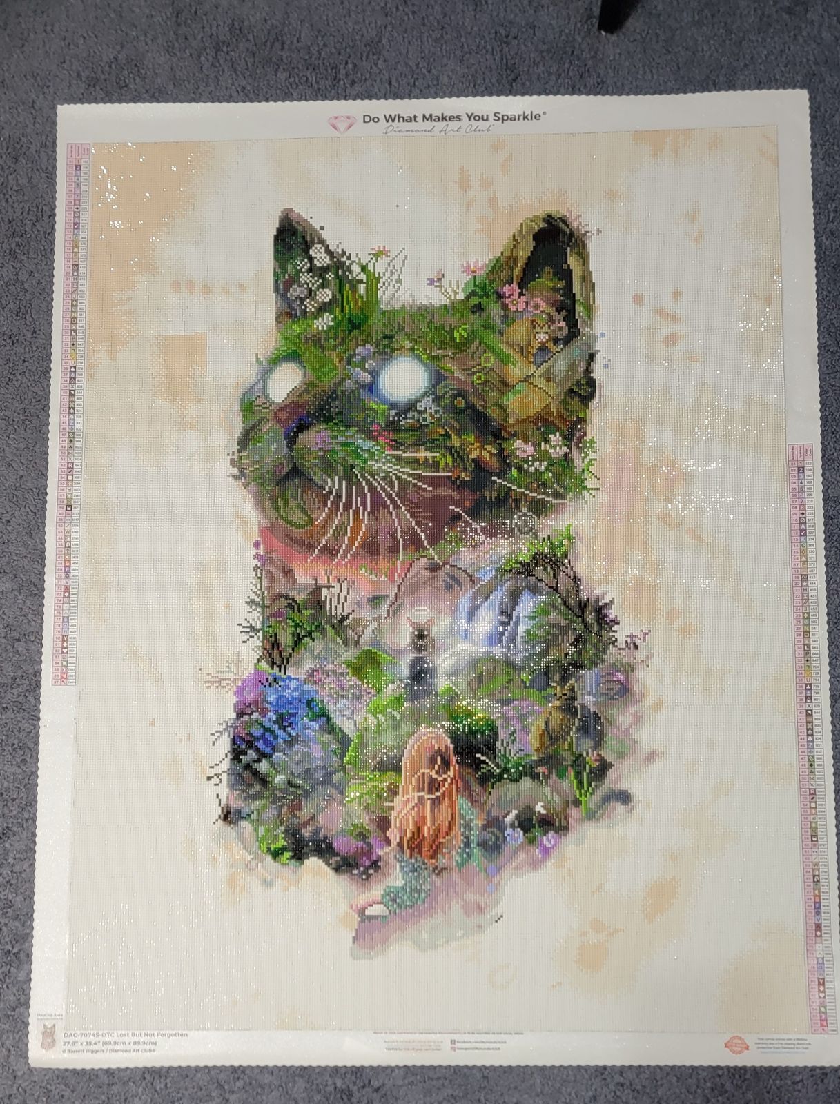 My second issue with this design is that there are a lot of things going on in this painting for the naked eye to decipher and I went against the tried and true adage of diamond painting which is to steer clear of things that are too busy as the rendering of the image will not come out clear. This painting is large and took up most of my kitchen table and even with it's size, which I thought would help making the girl's back and the cats sitting amongst the brush more visible, I just find it okay. This was not one…