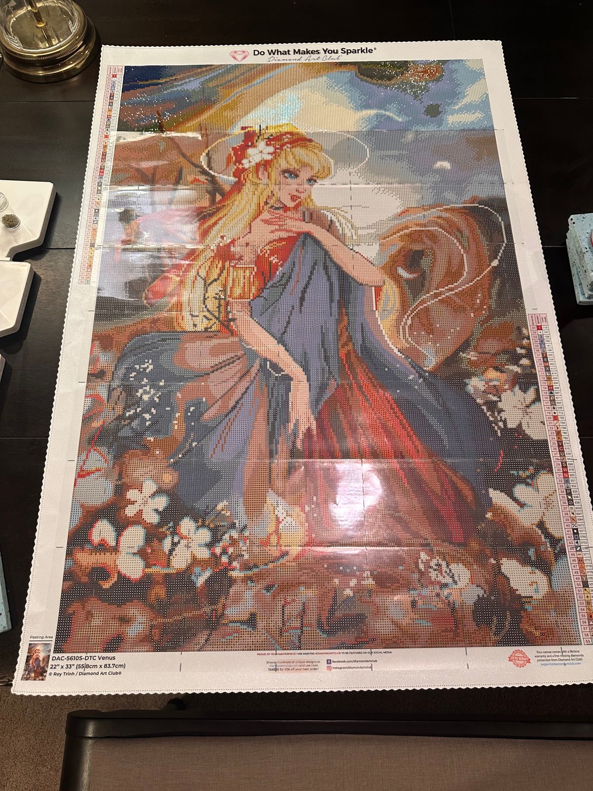 Venus by Roy Trihn is an absolute pleasure to work on. The drills are excellent quality, with consistent size, a great shine, and very little trash. Placement is smooth, gapping is minimal, and the canvas is rendered beautifully. Everything lines up the way it should, which makes the entire process relaxing and satisfying. I loved working on this kit! I would recommend.