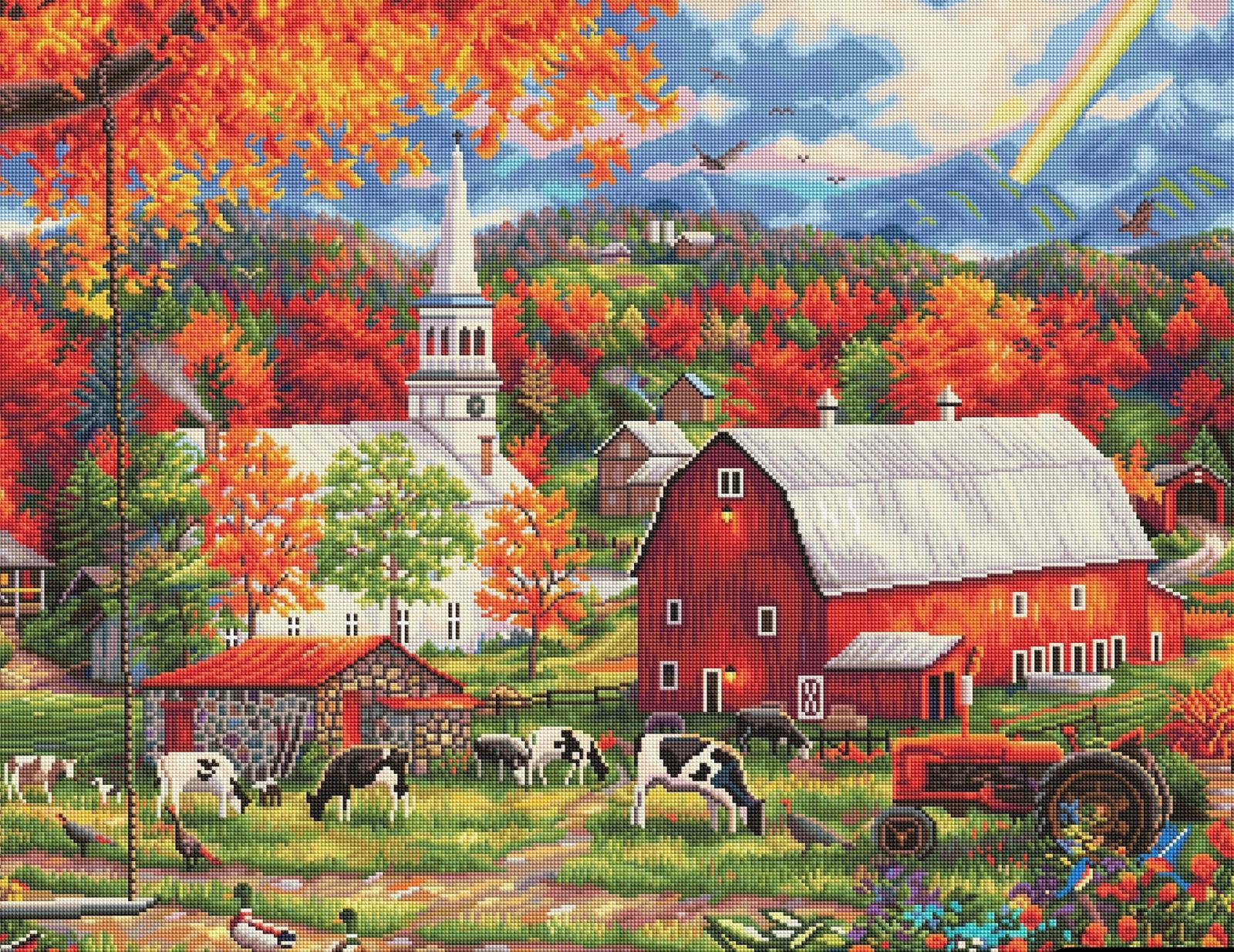 Bask in the sun on a perfect fall day at the farm. The church’s steeple shines brilliantly white, the barn glows candy-apple red, and the hills are filled with gold and amber treasure.