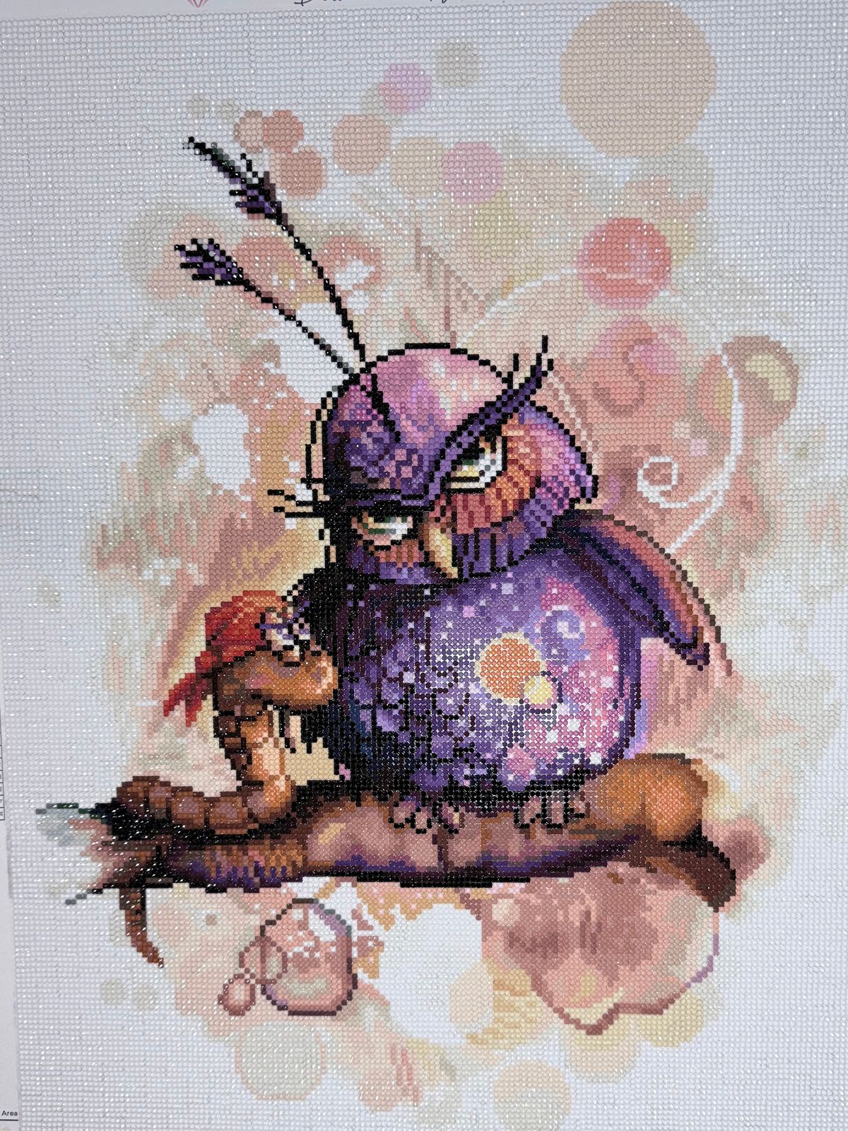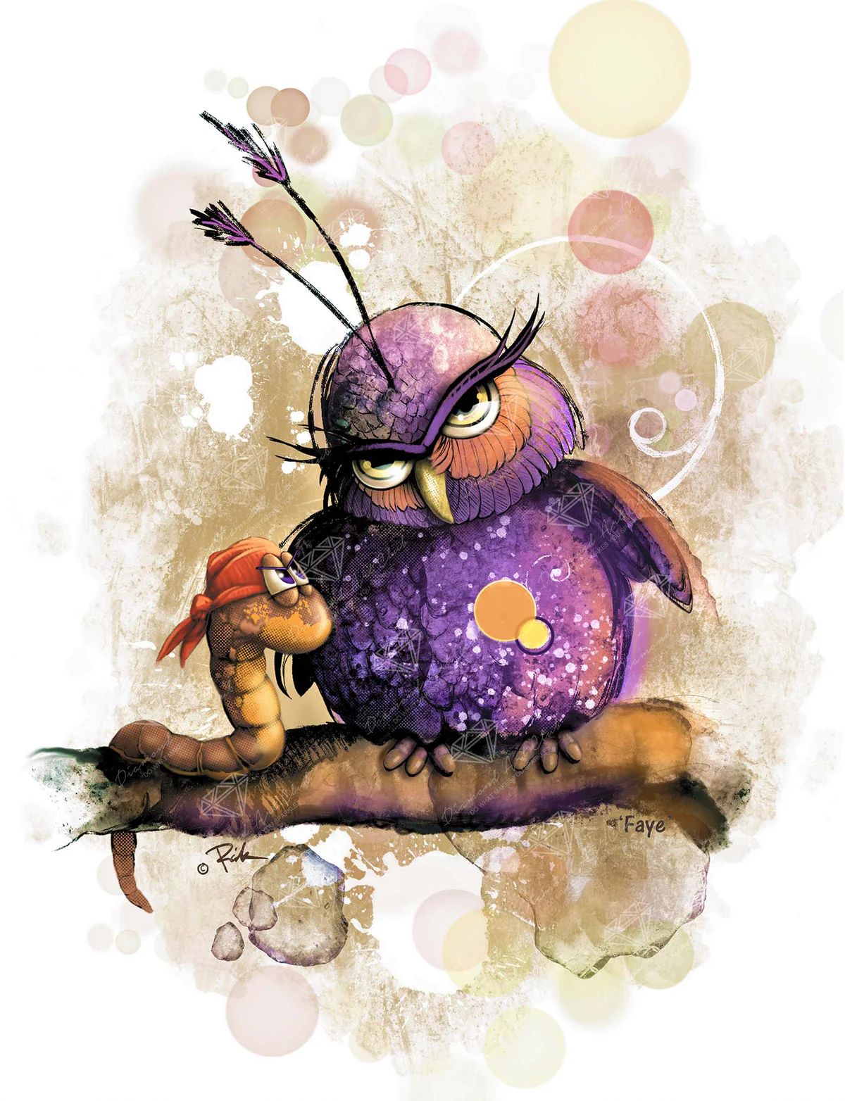 Perch on the edge of humor with a glittering purple owl and a bold little worm. Exchange stares sharper than talons as mischief meets defiance in a showdown too funny to resist.