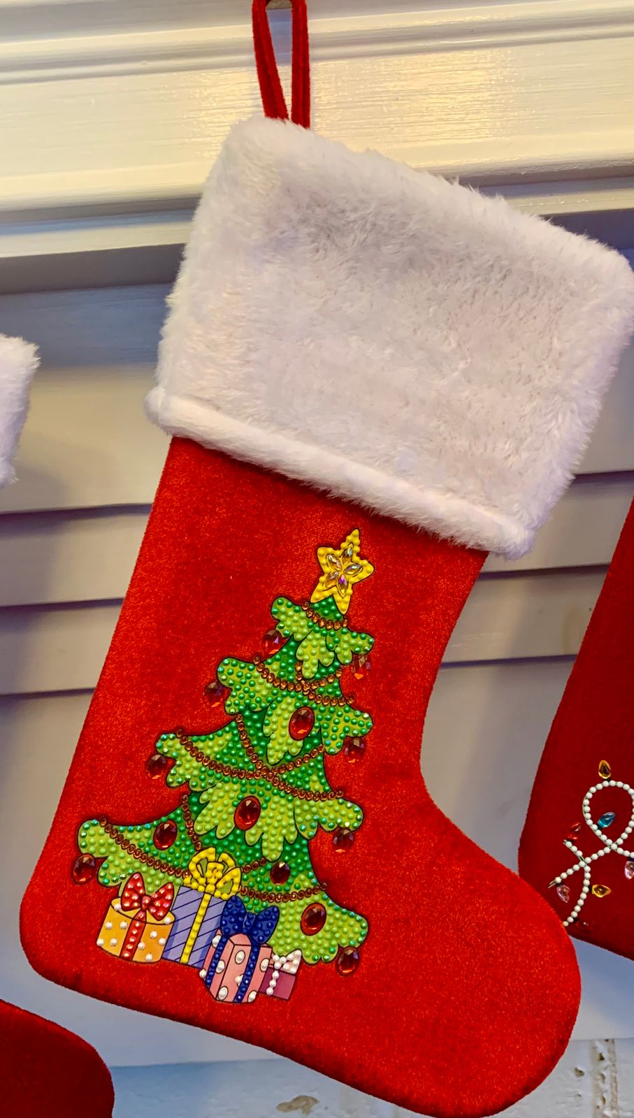 Hang up this festive stocking adorned with a sparkling Christmas tree and watch the holiday magic unfold! It's the perfect touch to bring cheer and delight to your holiday decor.