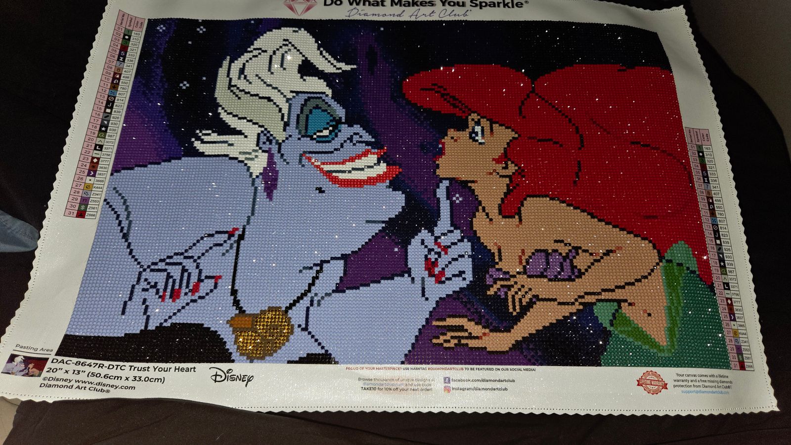Finished this in 9 days and was probably the fastest I've completed a painting. I absolutely loved working on this Little Mermaid diamond painting. The artwork is beautiful and captures that dreamy, underwater magic perfectly—the colors are vibrant, well-blended, and really sparkle once completed. The canvas was clear and sticky, with easy-to-read symbols that made the whole process relaxing rather than frustrating.
